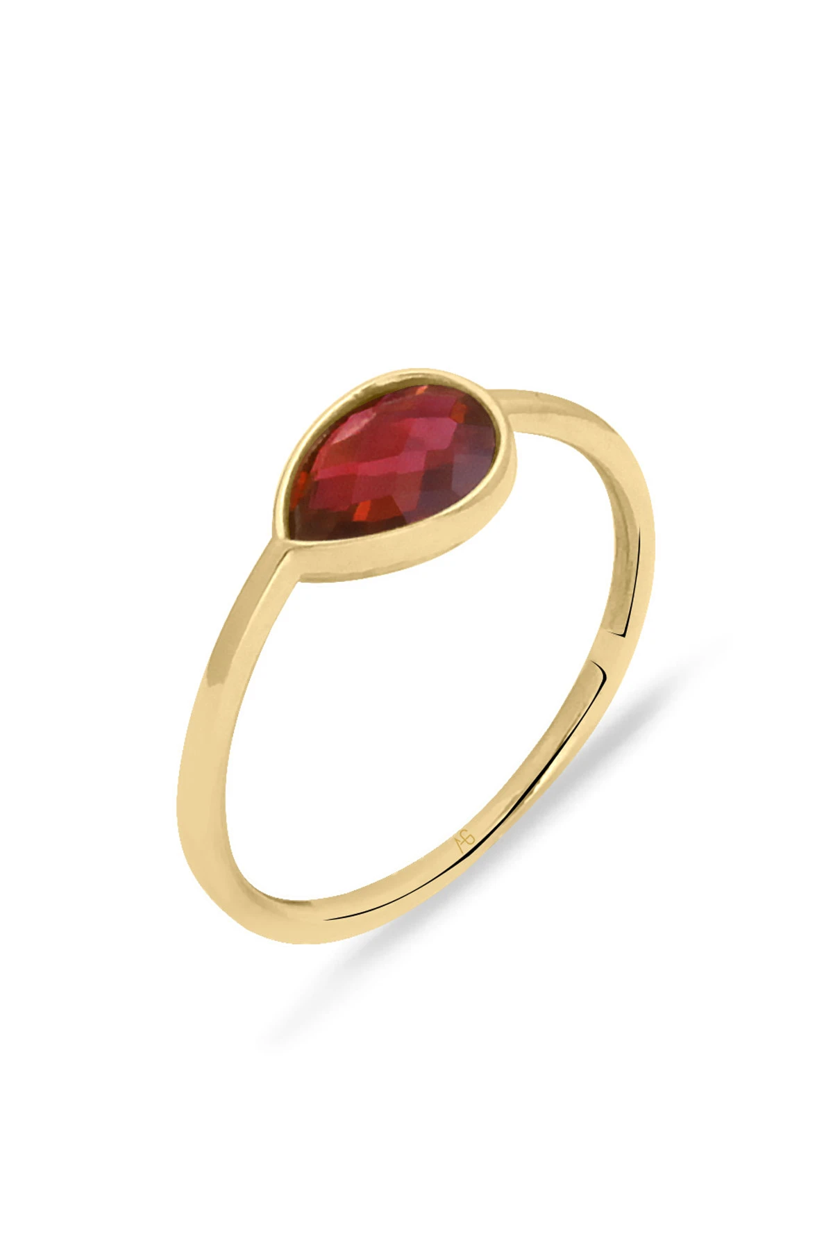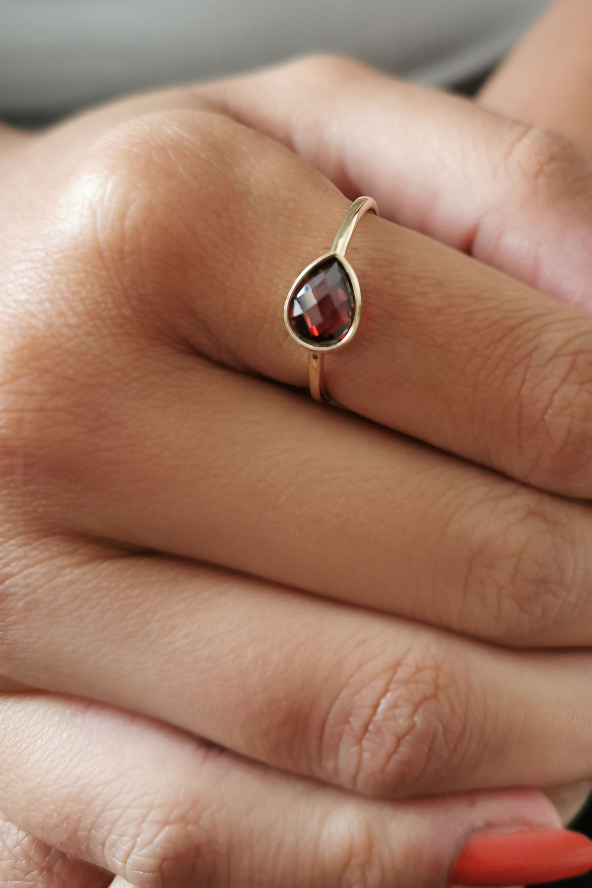 14 Ayar sade tasarımı ile zarif duruşa sahip damla kesim garnet kırmızı taşlı sevdiklerinize yada kendinize armağan olarak tercih edebileceğiniz modern model günlük kullanıma uygun 1.80 gram ağırlığında altın yüzük.