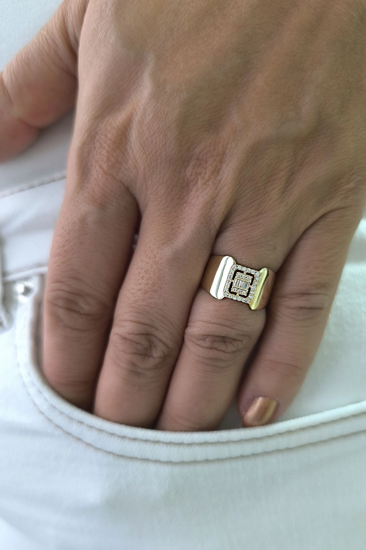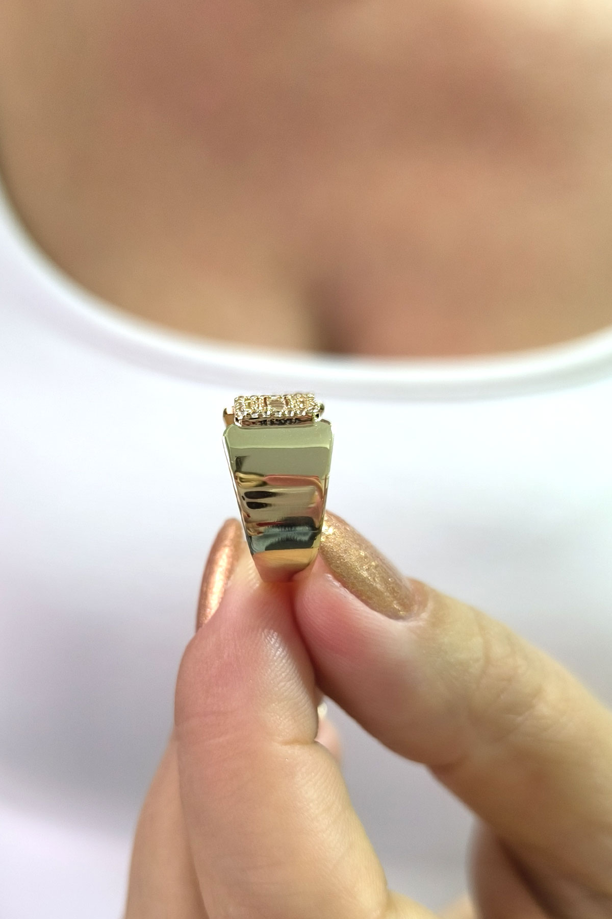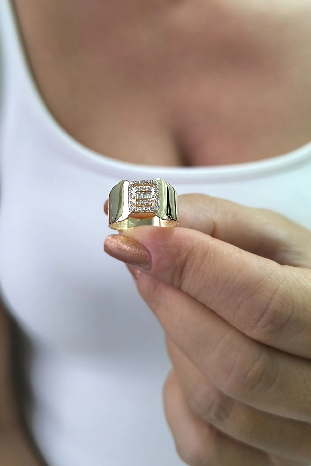 14 ayar sarı altın trend gösterişli tasarımıyla günlük kullanıma uygun parmağınızda stilinize hava katacak 2.70 gram ağırlığında baget taşlı yüzük.