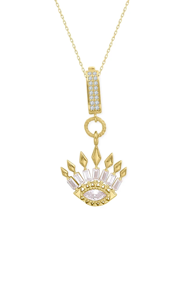 14 Ayar altın 4.00 gram ağırlığında şık ve gündelik kullanıma uygun 3.5 cm baget taşlı charm kilit olduça zarif bir duruşa sahip göz tasarım altın kolye.