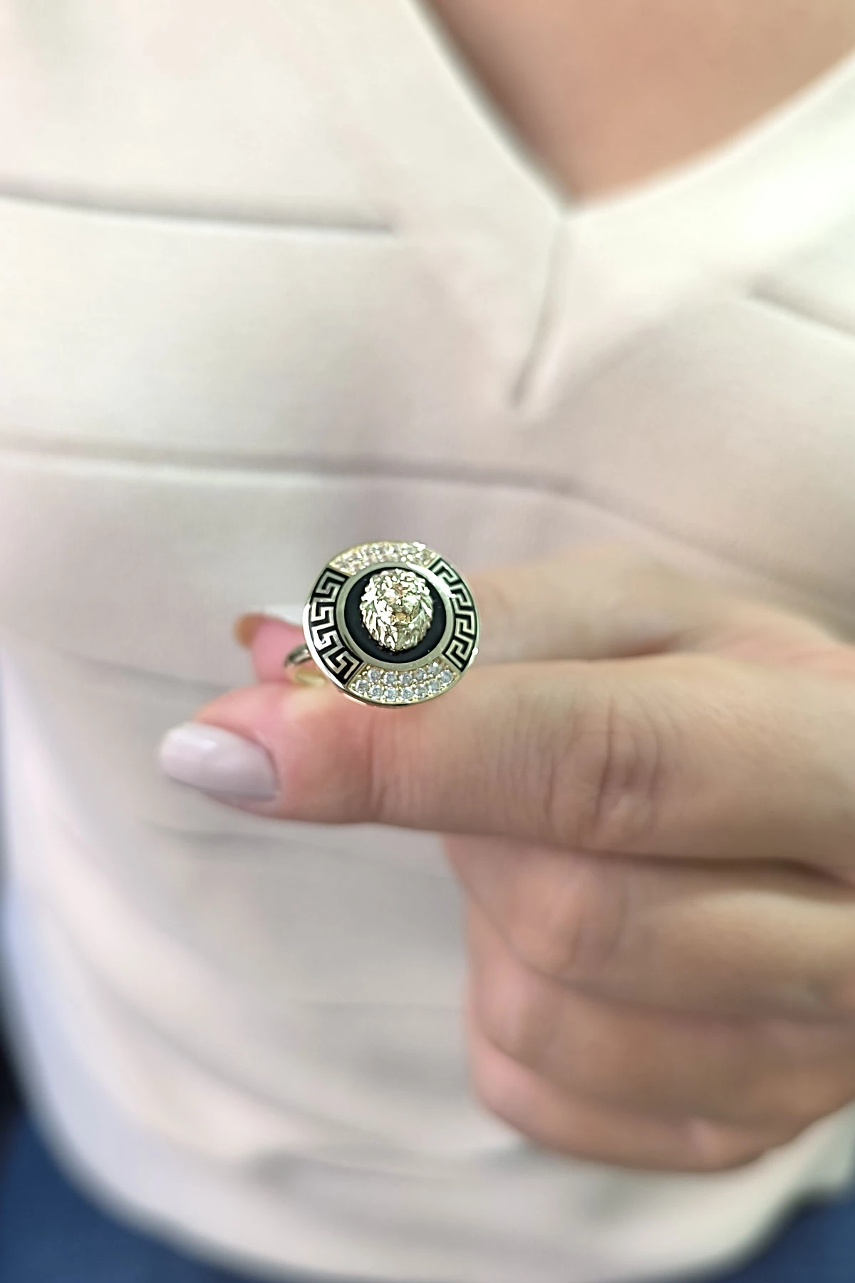 14 ayar sarı altın günlük kullanıma uygun 4.35 gram ağırlığında altın taş detaylı spor mineli grek işleme kenarlı  aslan model unisex yüzük.