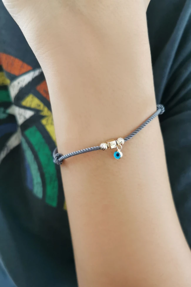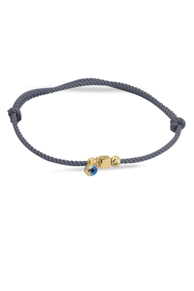 Gri ipli tasarımı ile günlük olarak saatlerinizle yada tek olarak kullanabileceğiniz sevdiklerinize doğum günü hediyesi olarak da armağan edebileceğiniz 14 ayar 0.65 gr ağırlığında 14 ayar altın dorika ve küp detaylı nazar bileklik.