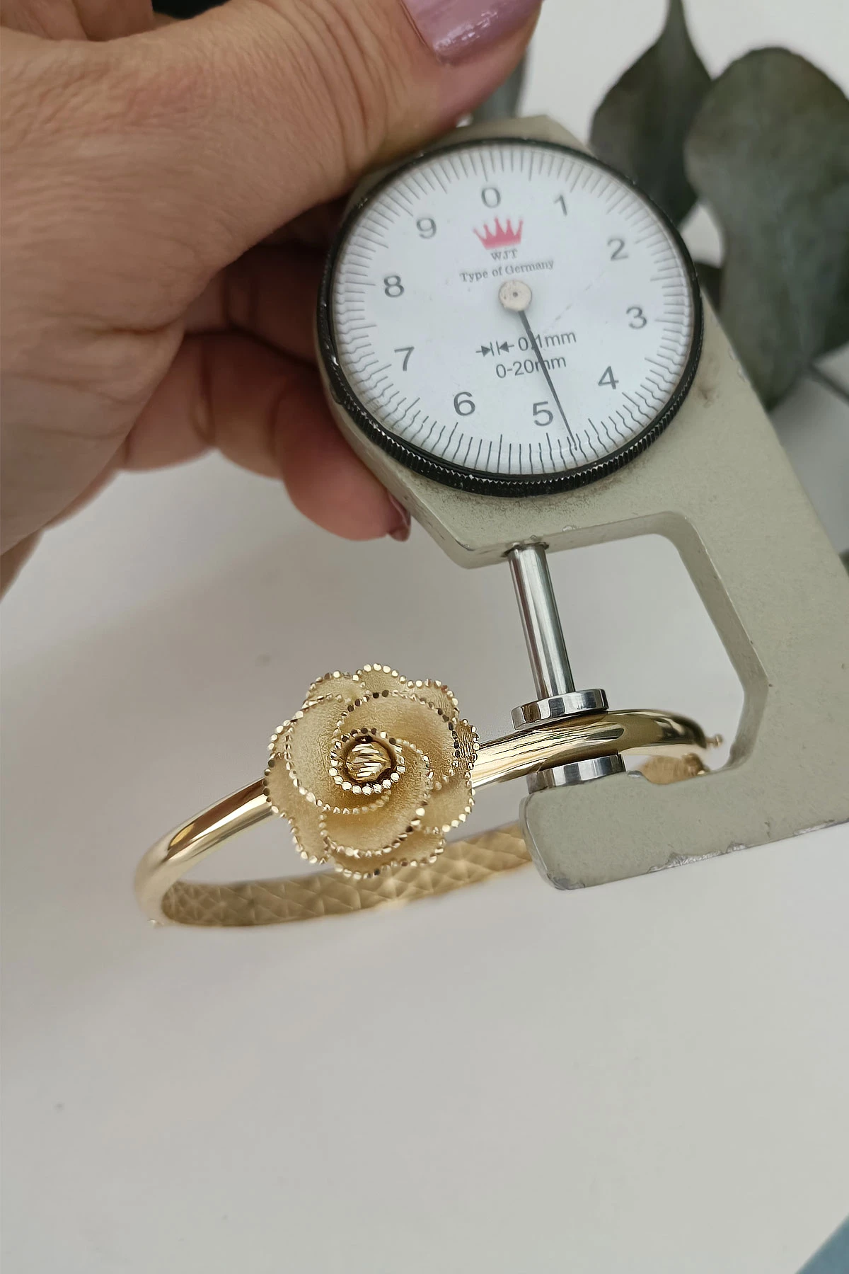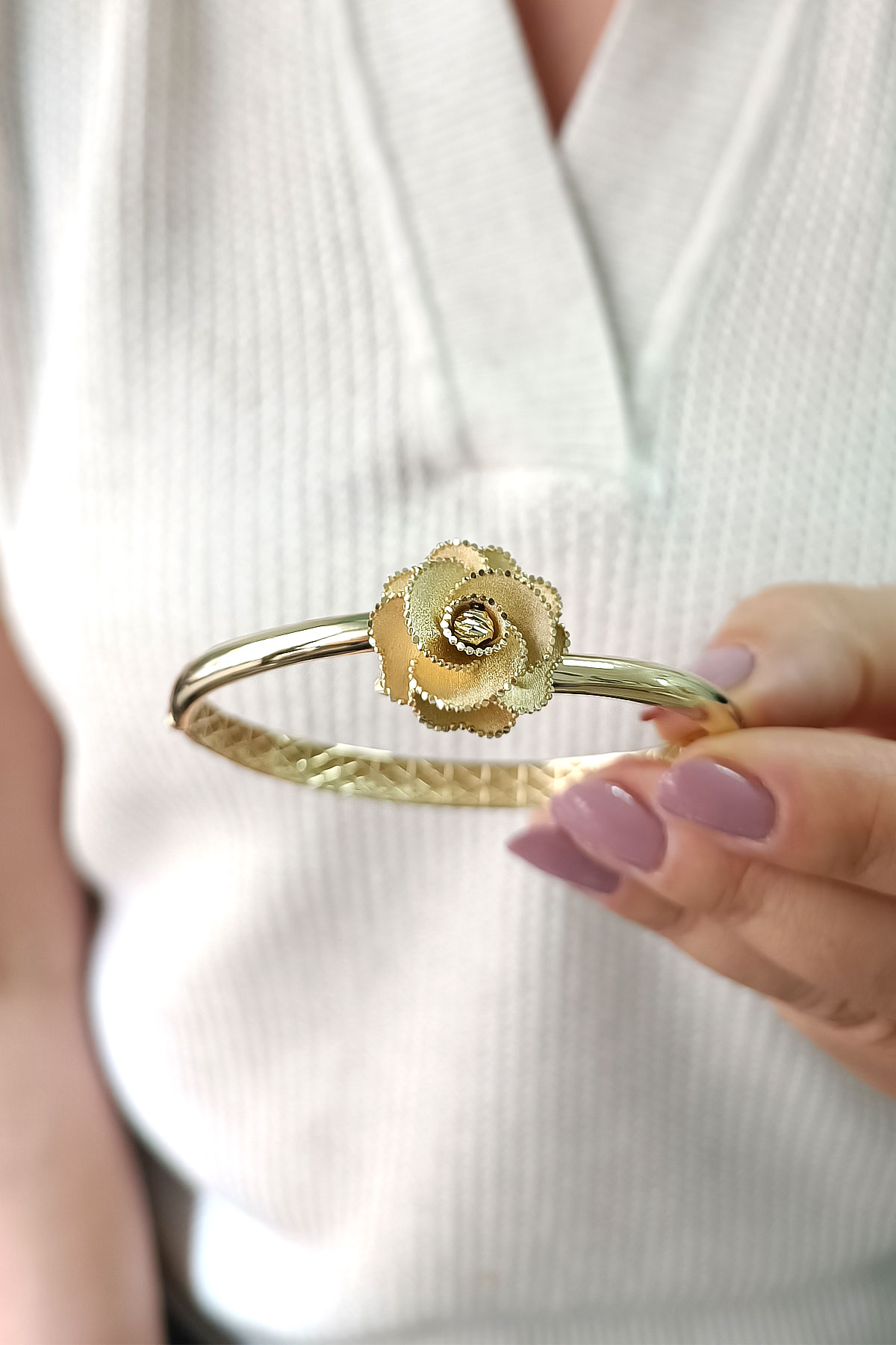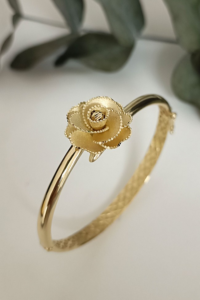 14 Ayar üst kısmında özel gül motifiyle şık tasarımı ile gösterişli ve elit duruşa sahip 9.60 gram ağırlığında altın kadın bilezik.