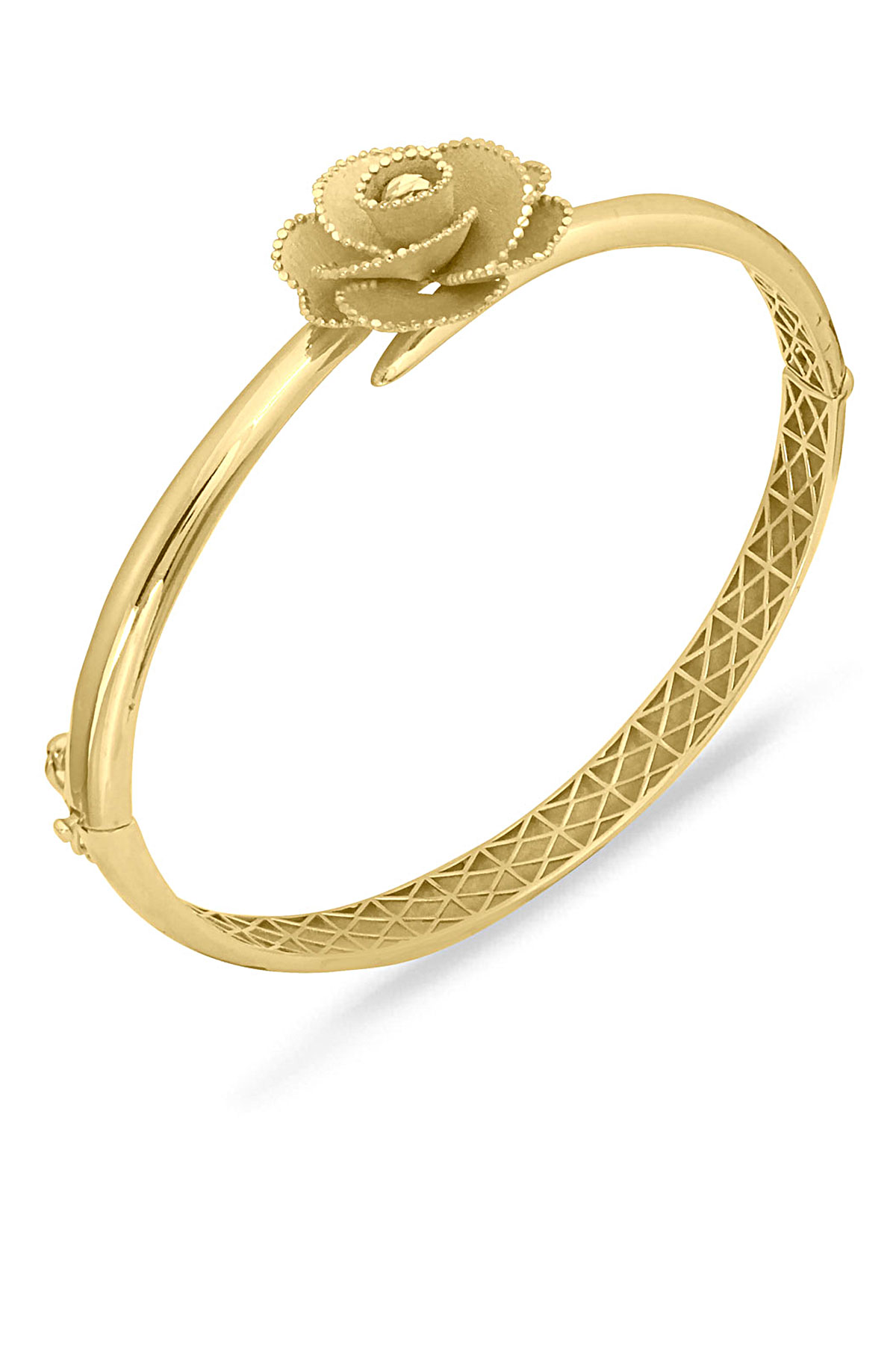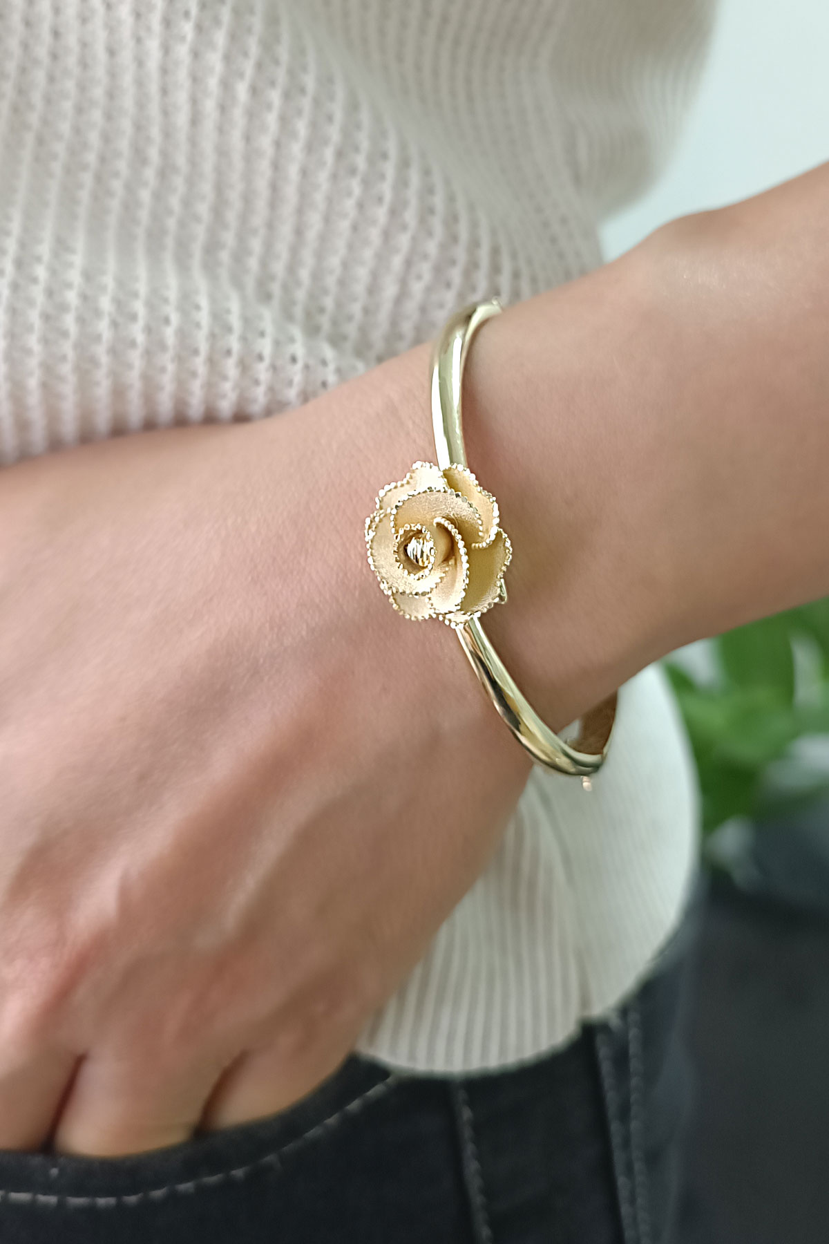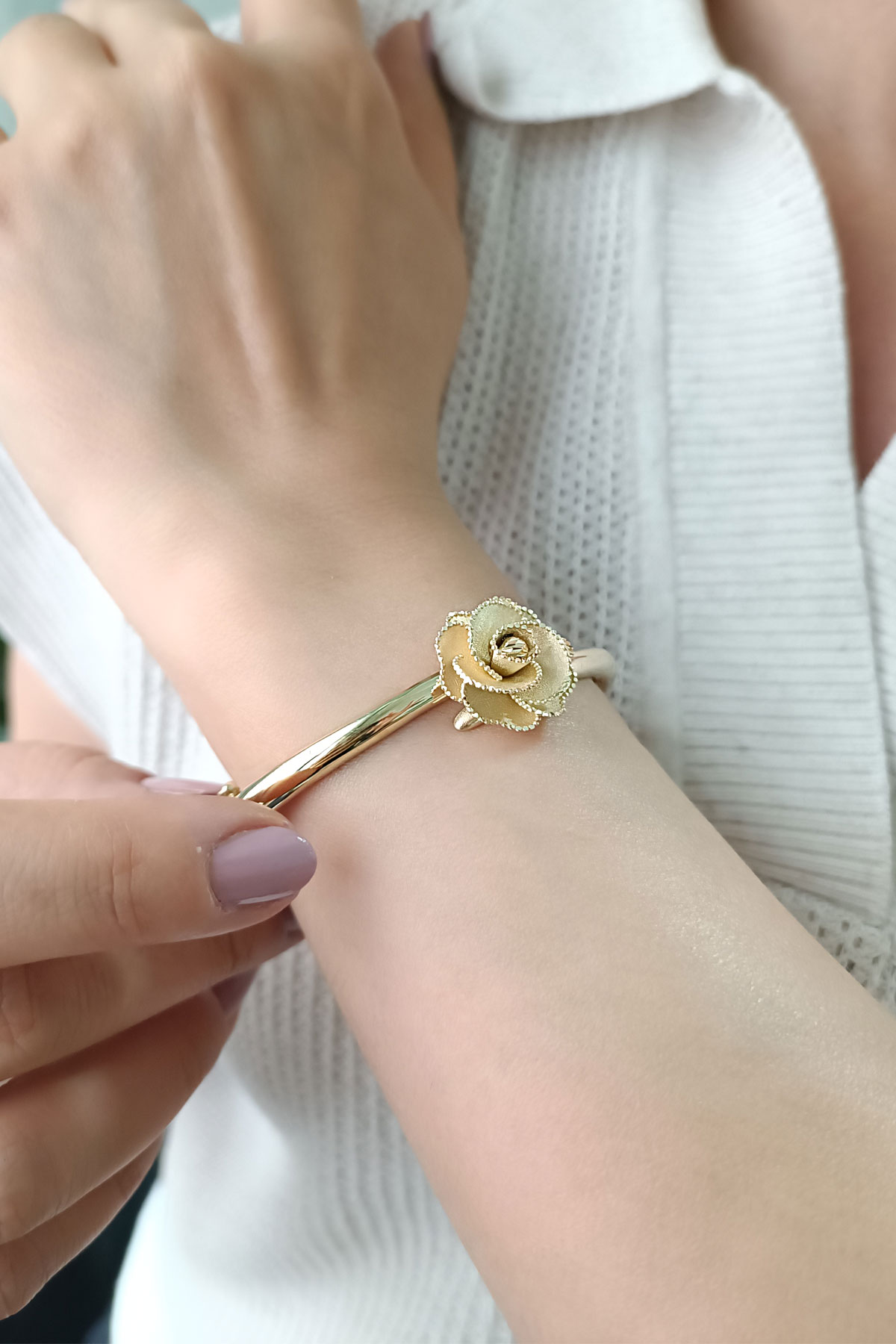 14 Ayar üst kısmında özel gül motifiyle şık tasarımı ile gösterişli ve elit duruşa sahip 9.60 gram ağırlığında altın kadın bilezik.