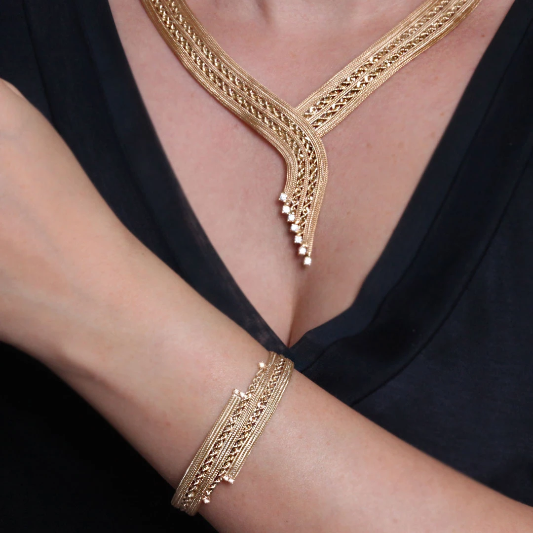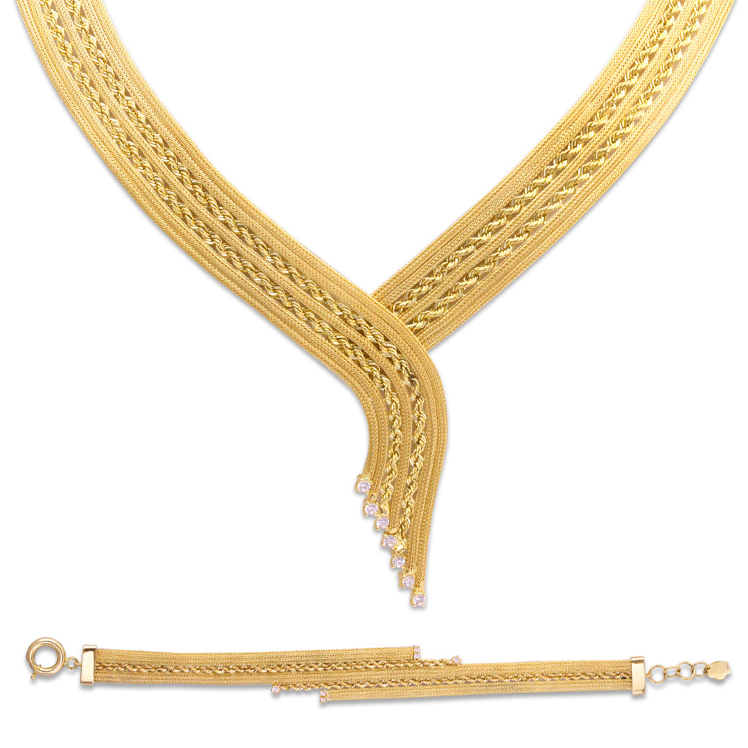 14 Ayar iki farklı zincirin muhteşem uyumuyla tasarlanmış taş detayları ile oldukça zarif bir duruşa sahip gerdanlık ve bileklikten oluşan ikili düğün/nişan takı seti.