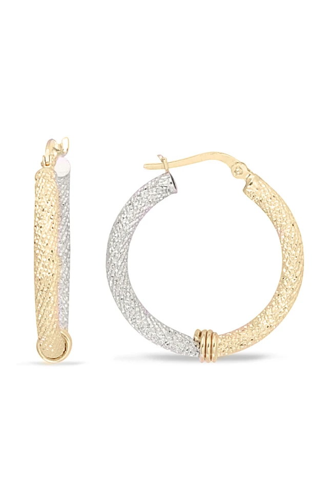 3.00 Gram Ağırlığında 14 Ayar Altın Spor ve Günlük Kullanıma Uygun Her Sezonun Trend Modası Olmayı Başaran Sarı Ve Beyaz Kombinasyonlu Model 3.5 Cm Halka Küpe.