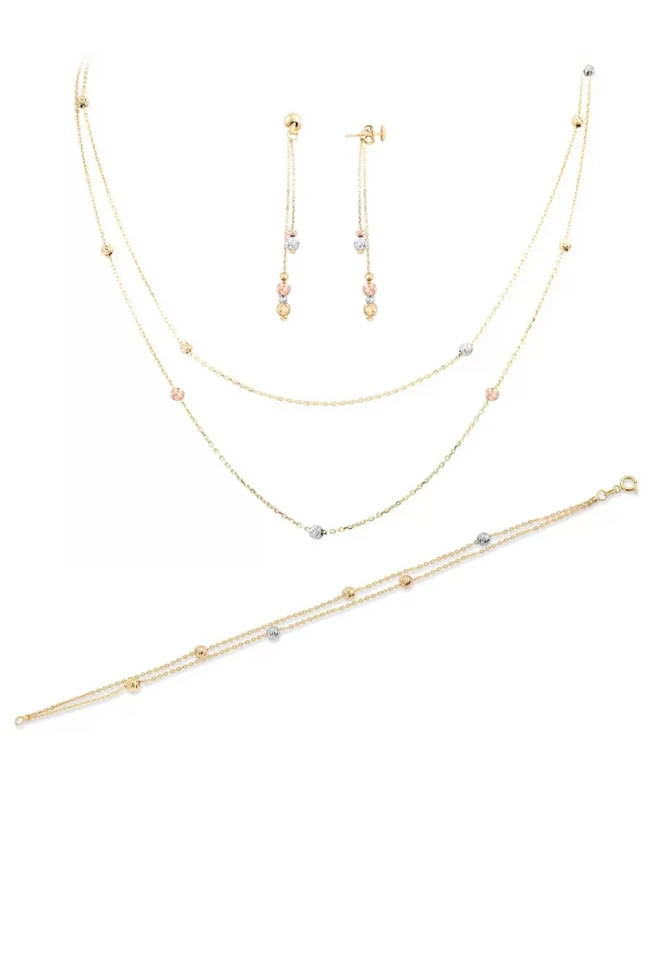 7.00 Gram Ağırlığında Kalemli Yuvarlak Serpme Toplardan Tasarlanmış Şık Bir Tarzı Olan 14 Ayar Altın Top Kolye, Küpe ve Bileklik Takımı.