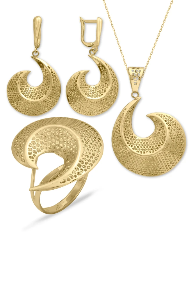 14 Ayar petekli ay model gösterişli duruşa sahip günlük kullanıma uygun tasarımları sevenlere özel gün boyu tüm kombinlerinize eşlik edecek 13 gram ağırlığında altın taşsız italyan üçlü takım.