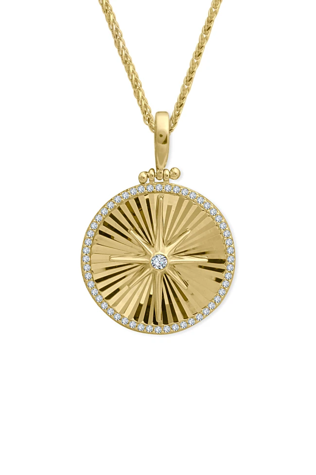 Işıl Işıl ve farklı havaya sahip yuvarlak form 6.80 gr. 3.5 cm boyutunda kalemli model 14 ayar altın kuzey yıldızı detaylı kolye.