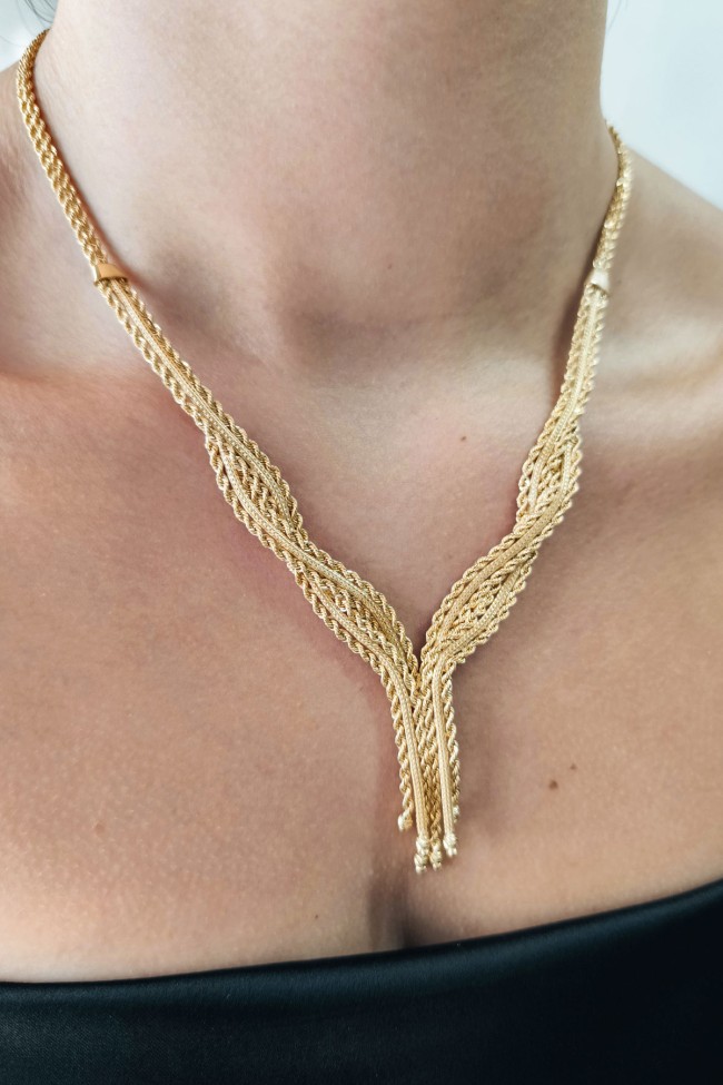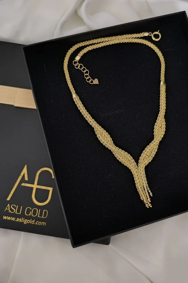 14 Ayar taşsız, modern ve havalı tasarım ışıl ışıl model oldukça iddialı bir tasarıma sahip halat ve kalze zincir geçişli 16.30 gram ağırlığında altın gerdanlık.