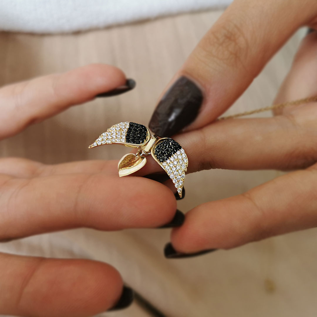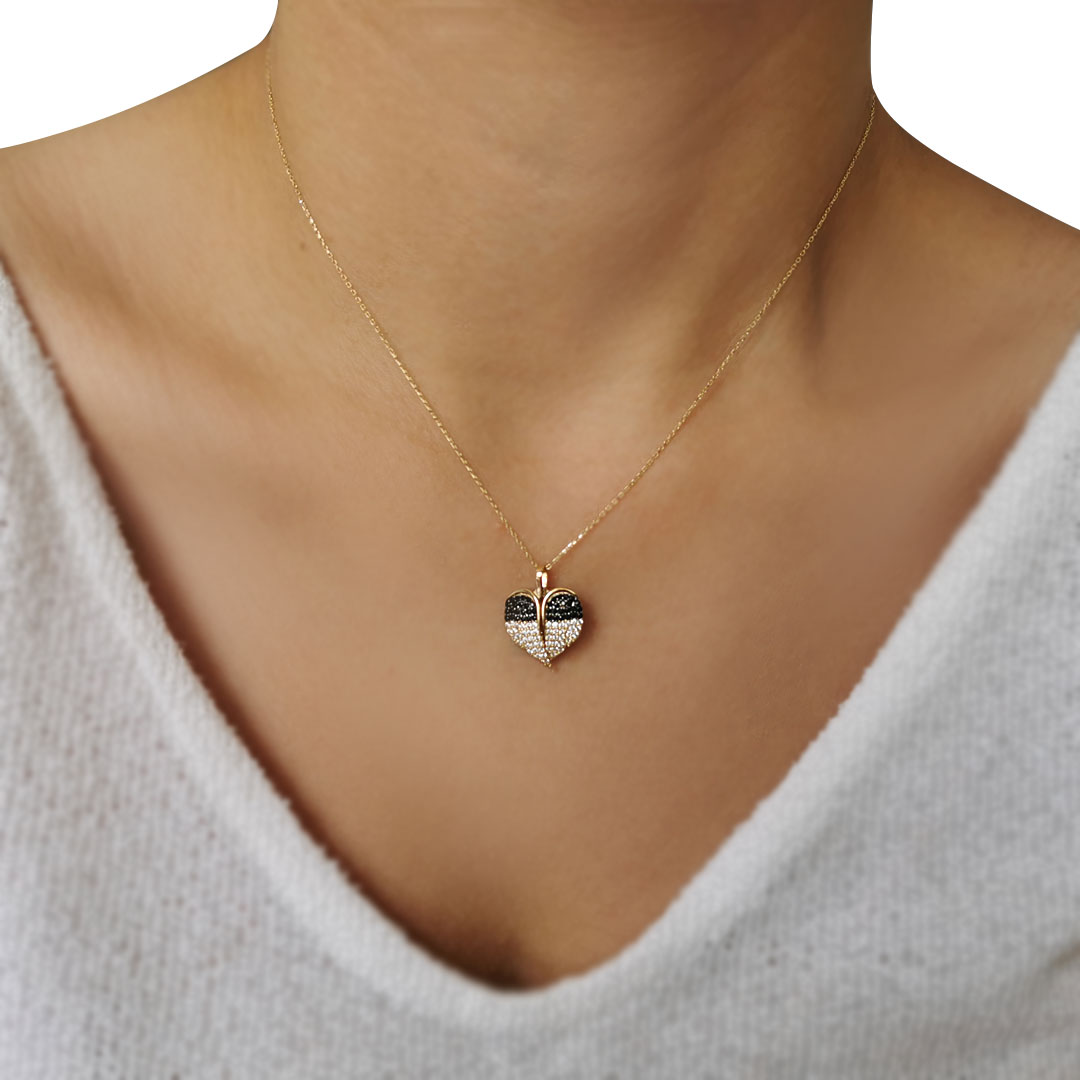 45 Cm zincirli 3.10 gr. 2 cm boyutunda zirkon siyah/beyaz taşlı model 14 ayar altın şık ve hoş bir duruşa sahip kalp kolye. Kalbin iç kısmına ücretsiz olarak harf ve isim ve tarih gibi özel yazı yazılmaktadır. *Ürünlerimiz faturalıdır güvenle satın alabilirsiniz, özel hediye kutusunda ücretsiz kargo ile gönderilecektir.
