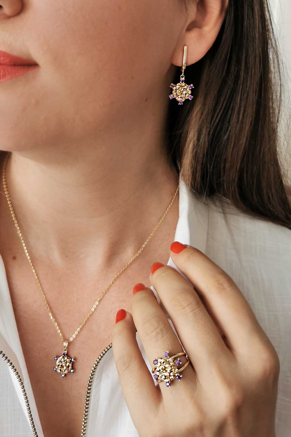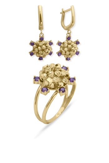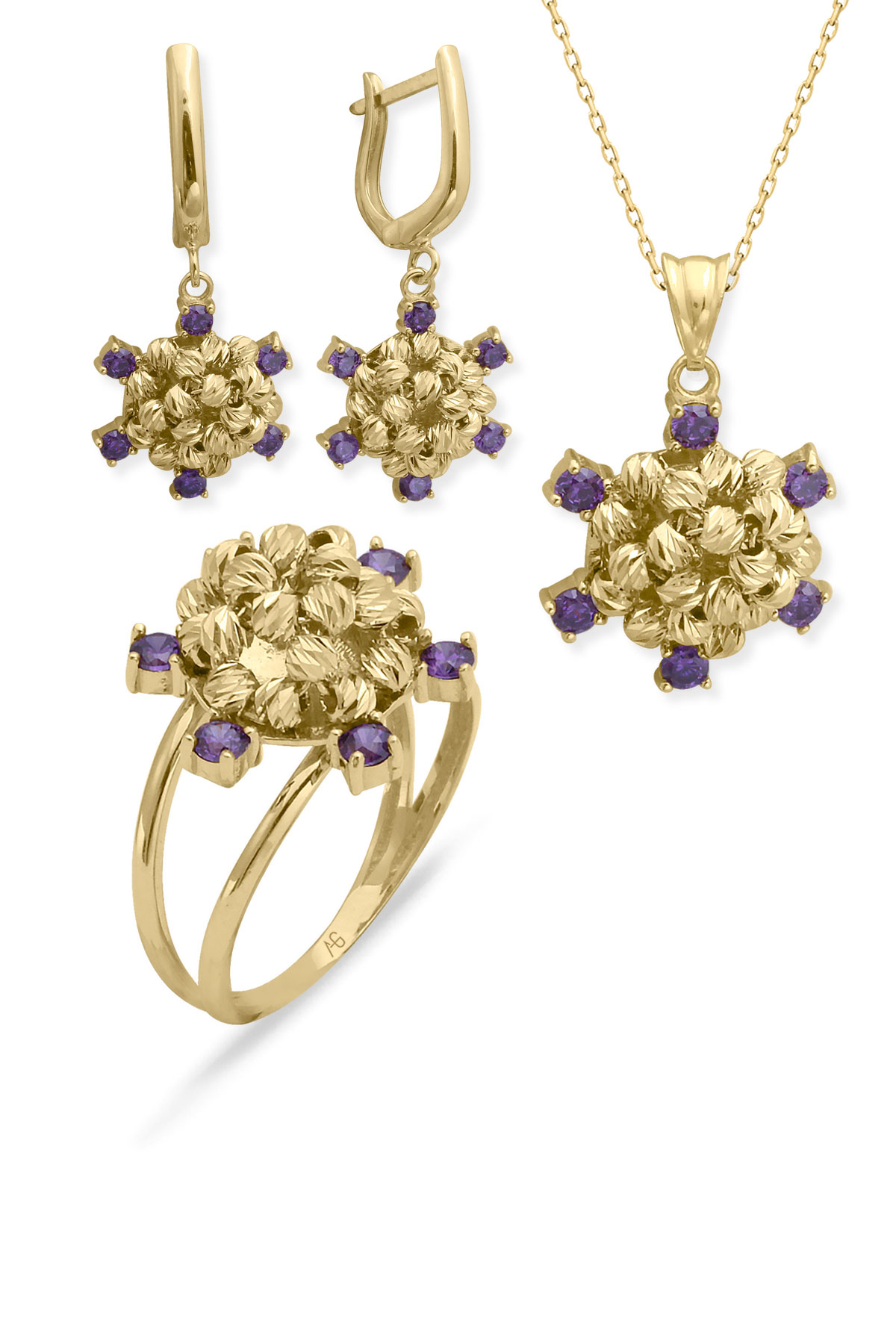 12.30 Gram Ağırlığında Ametist Taşlı Işıl Işıl Kartanesini Andıran Şık Tasarımıyla Göz Dolduran 14 Ayar Altın Küpe Yüzük Kolye Takım.