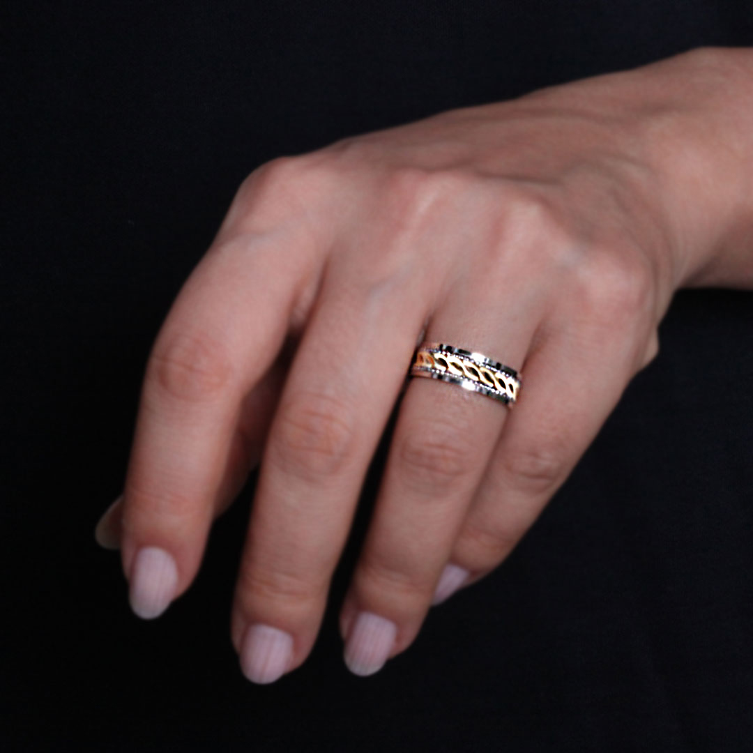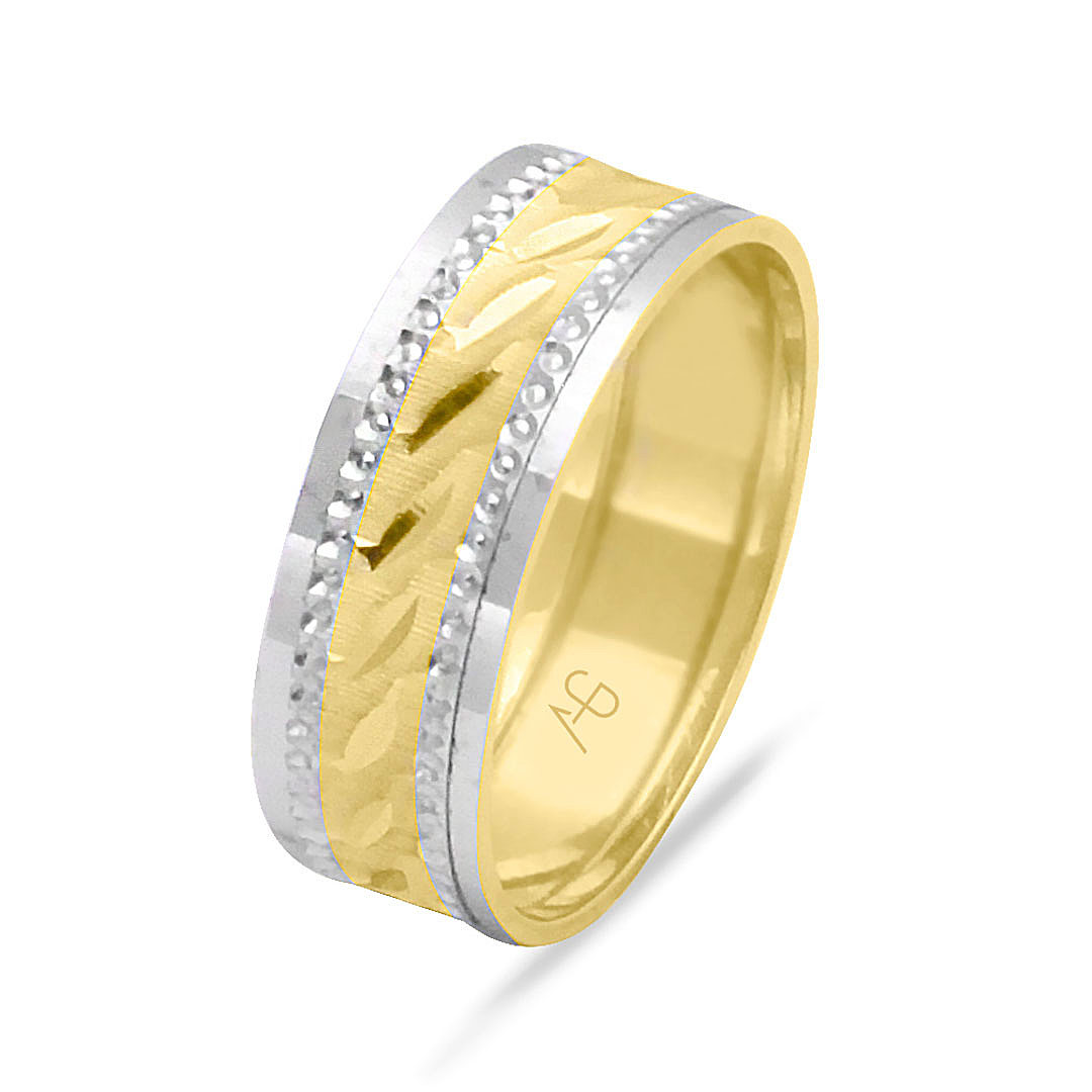 14 Ayar sarı - beyaz altın ortası yarma kalem desenli modeliyle şık duruşa sahip orta kalınlıkta model günlük kullanıma sahip 2.45 gram ağırlığında taşsız hem kadın hem erkek için uygun unisex tasarım alyans.