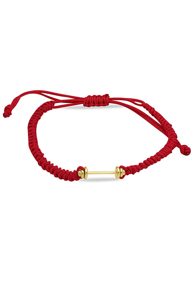 Dambıl detaylı tasarımı ile günlük olarak da kullanabileceğiniz, özel günlerinde sevdiklerinize şık bir hediye seçeneği olacak 1.20 gr ağırlığında 14 ayar altın taşsız kırmızı özel örgü ip detaylı spor bileklik.
