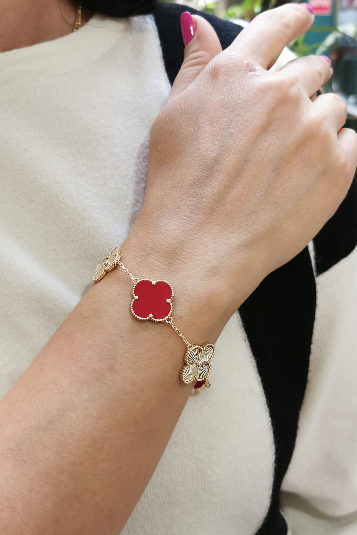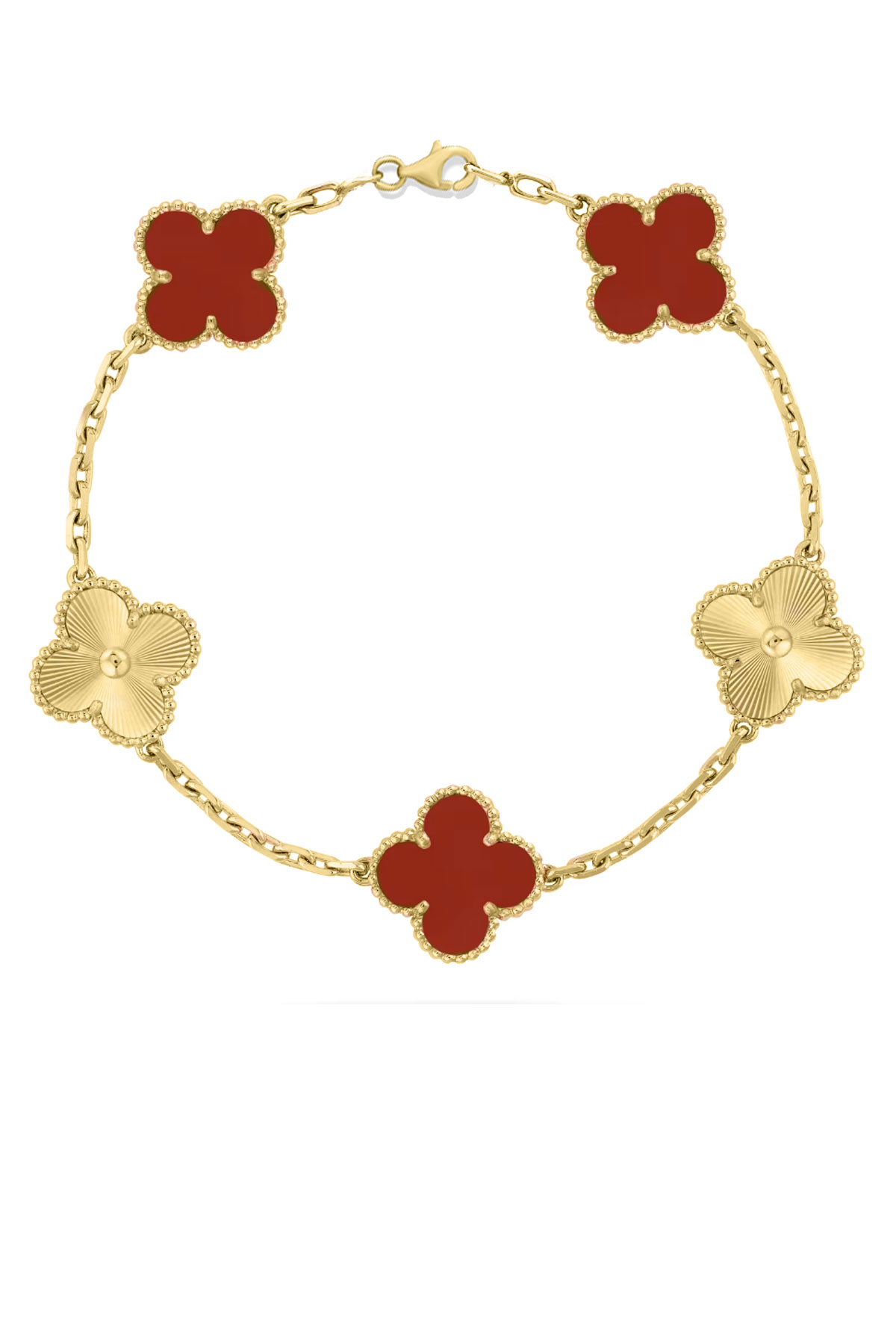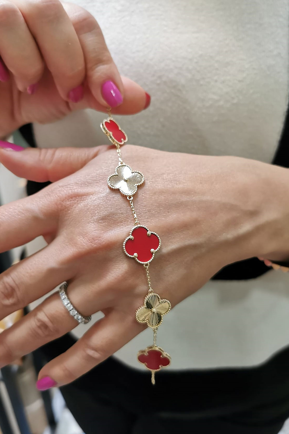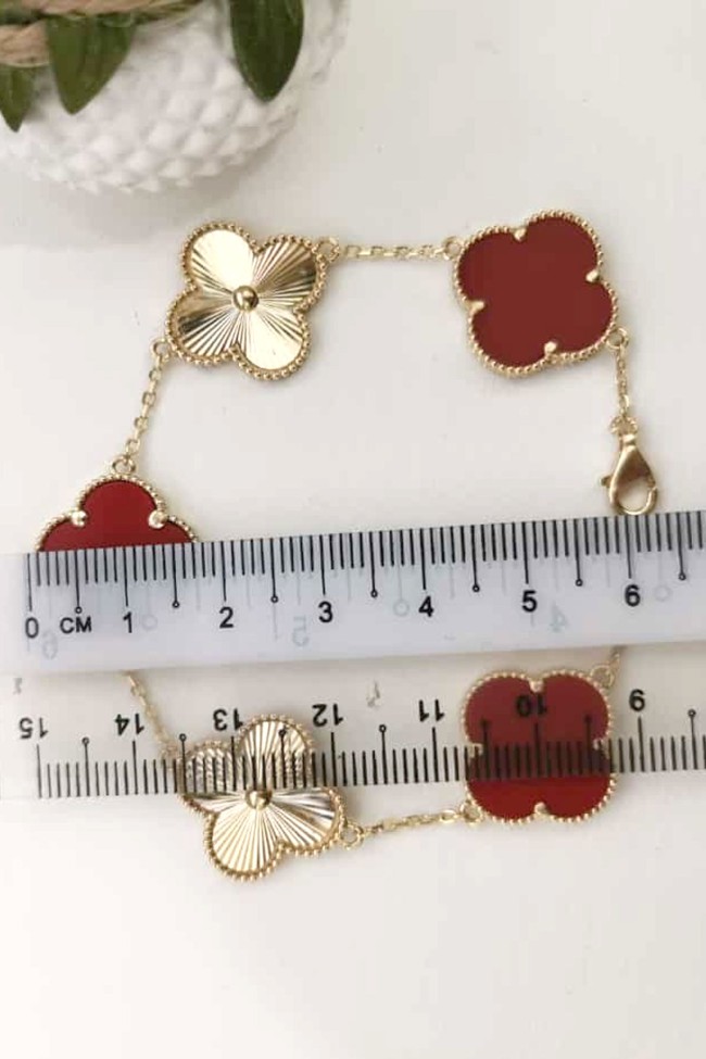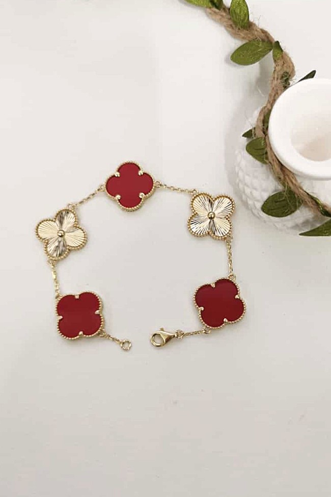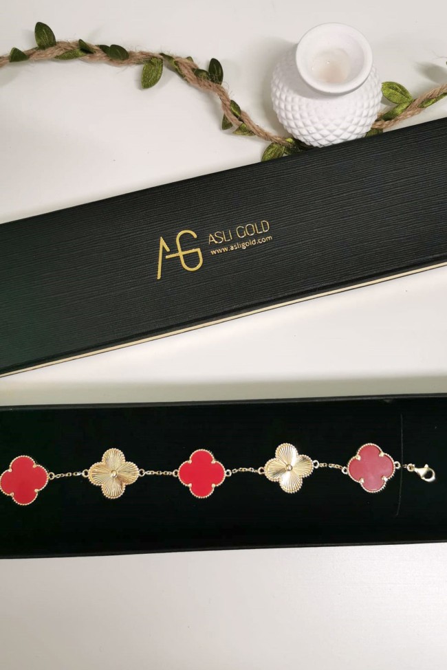10.80 Gram Ağırlığında 19 Cm Kırmızı Taş Atlamalı Kalemli Parçalardan Tasarlanmış Şık Bir Tarzı Olan 14 Ayar Altın Tasarım Beşli Yonca Bileklik.