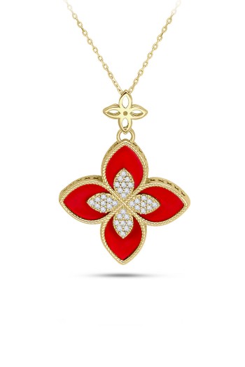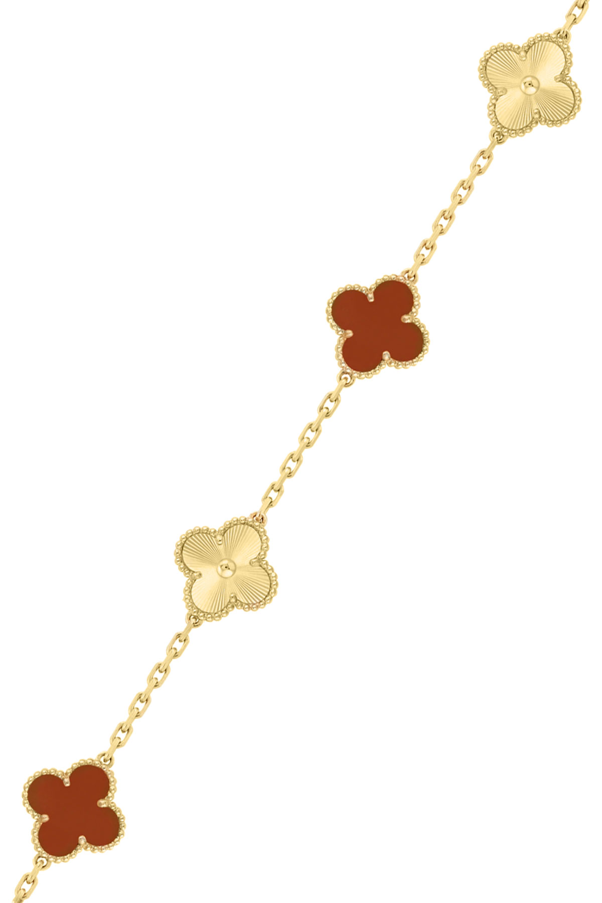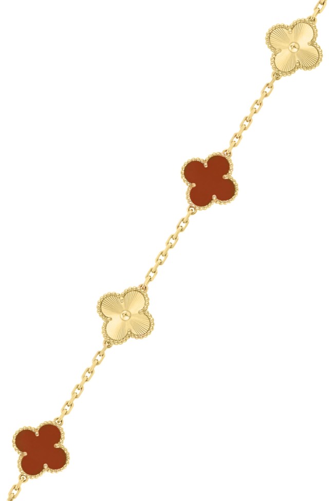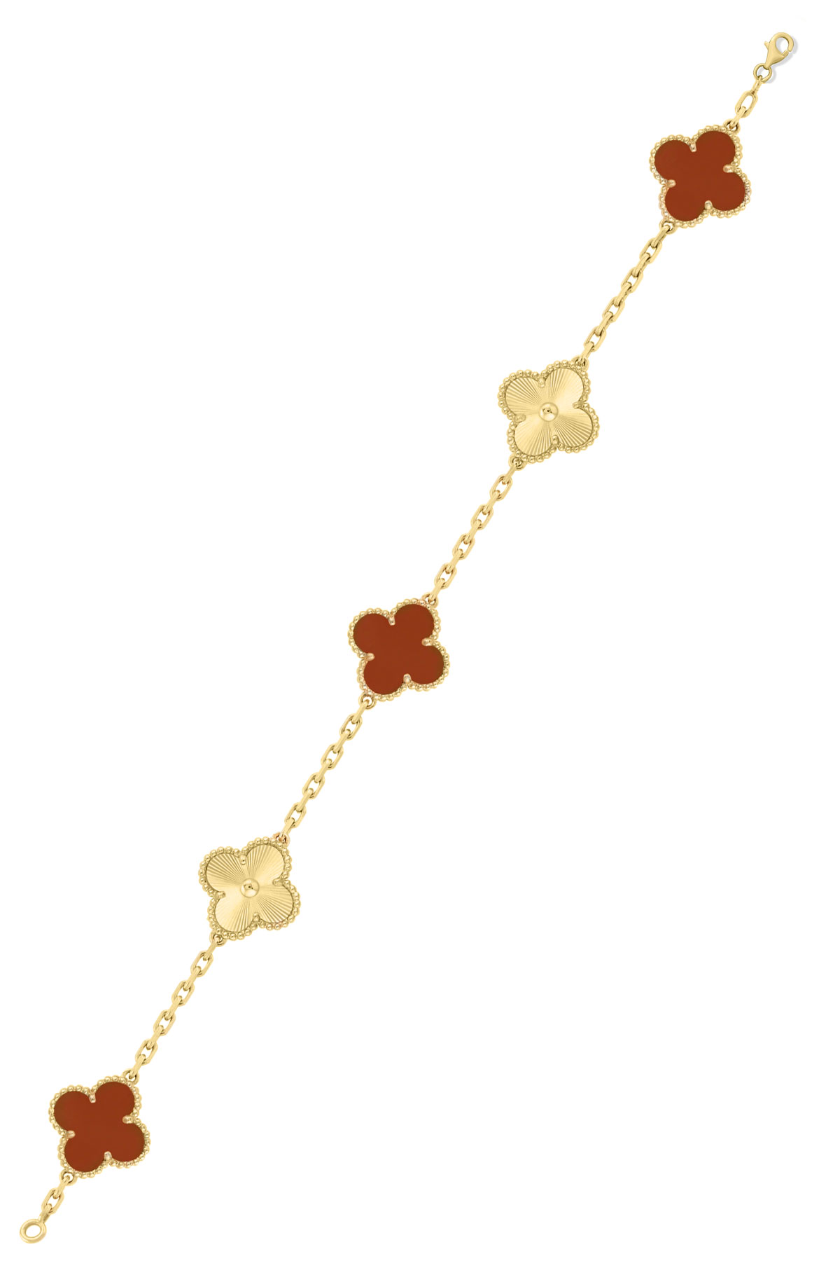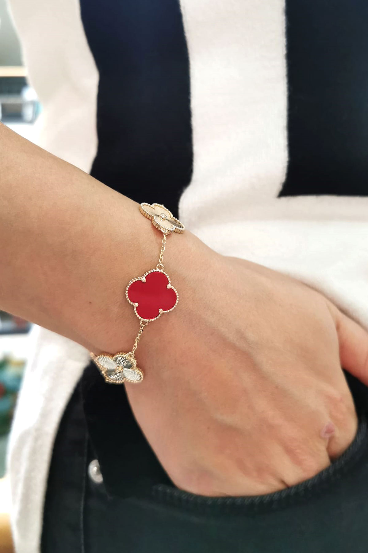 10.80 Gram Ağırlığında 19 Cm Kırmızı Taş Atlamalı Kalemli Parçalardan Tasarlanmış Şık Bir Tarzı Olan 14 Ayar Altın Tasarım Beşli Yonca Bileklik.