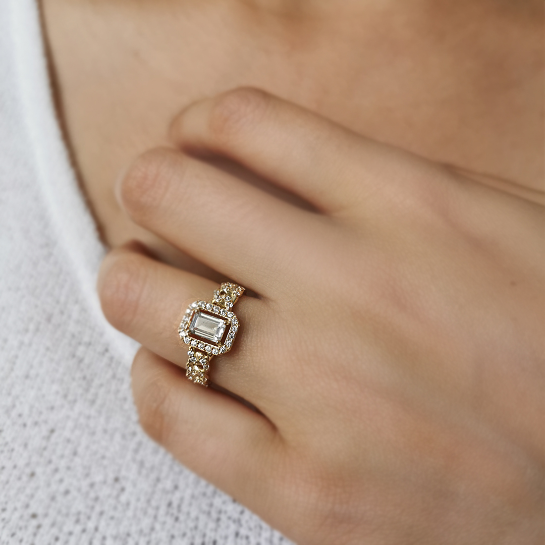2.60 Gram Ağırlığında Kolu Taşlı Baget Detaylı Tasarımıyla Oldukça Şık Ve Havalı Bir Duruşa Sahip 14 Ayar Altın Zirkon Taşlı Kadın Yüzük.