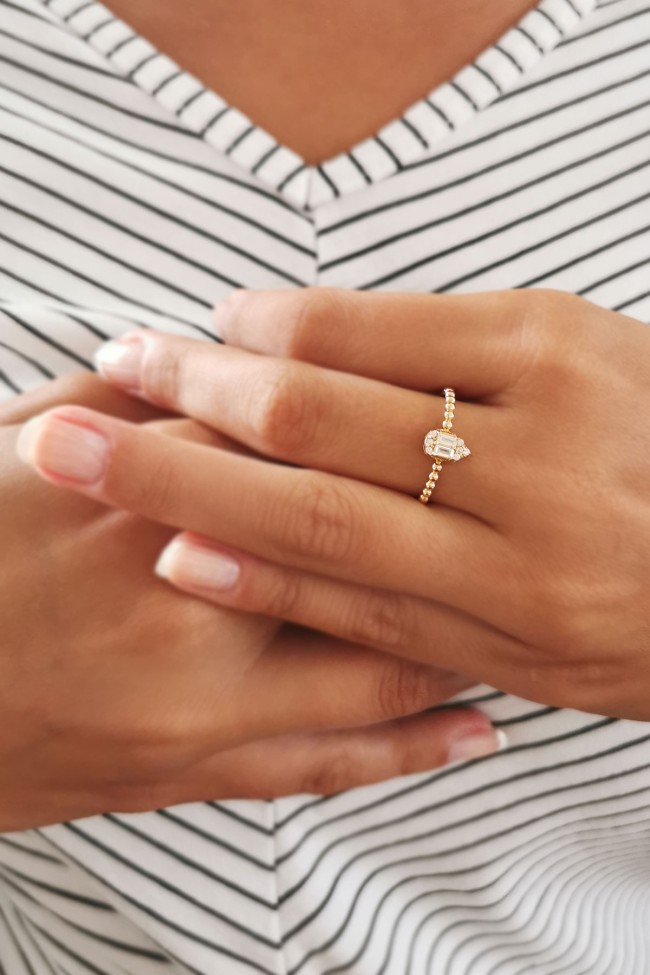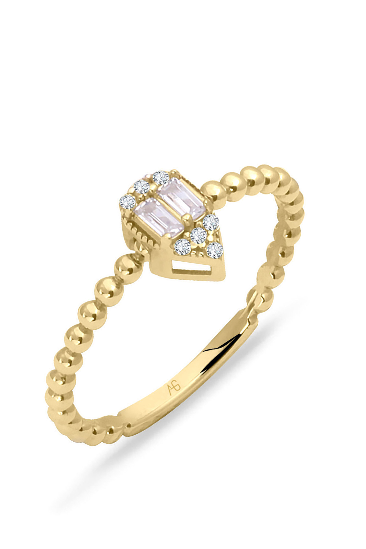 1.85 Gram Ağırlığında Köşeli Damla Tasarımına Eşlik Eden Baget Taş Detaylı Günlük Kullanıma Uygun 14 Ayar Altın Minimal Yüzük.
