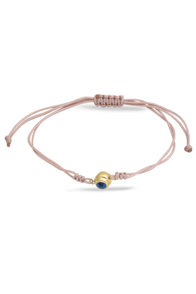 Krem rengi ip tasarımı ile günlük olarak saatlerinizle yada tek olarak kullanabileceğiniz sevdiklerinize doğum günü hediyesi olarak da armağan edebileceğiniz 14 ayar 0.50 gr ağırlığında 14 ayar altın nazar bileklik.
