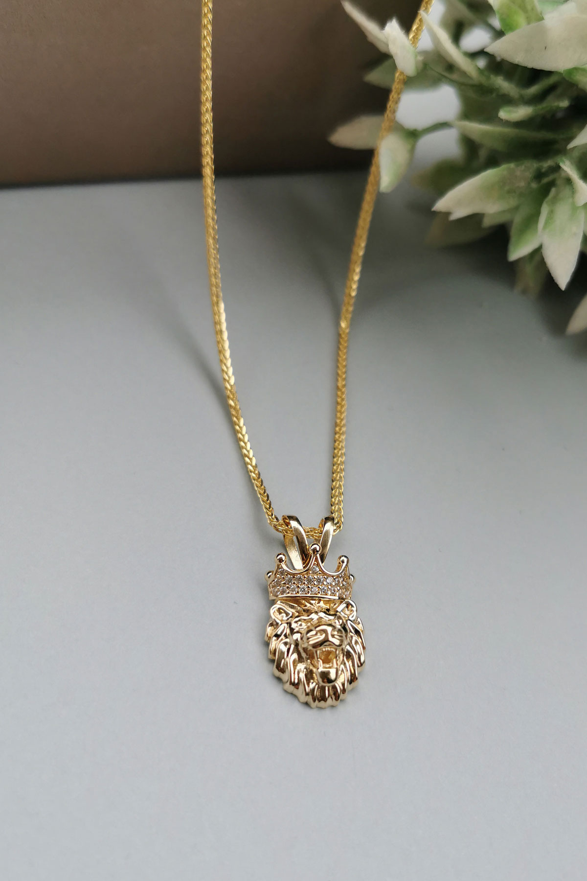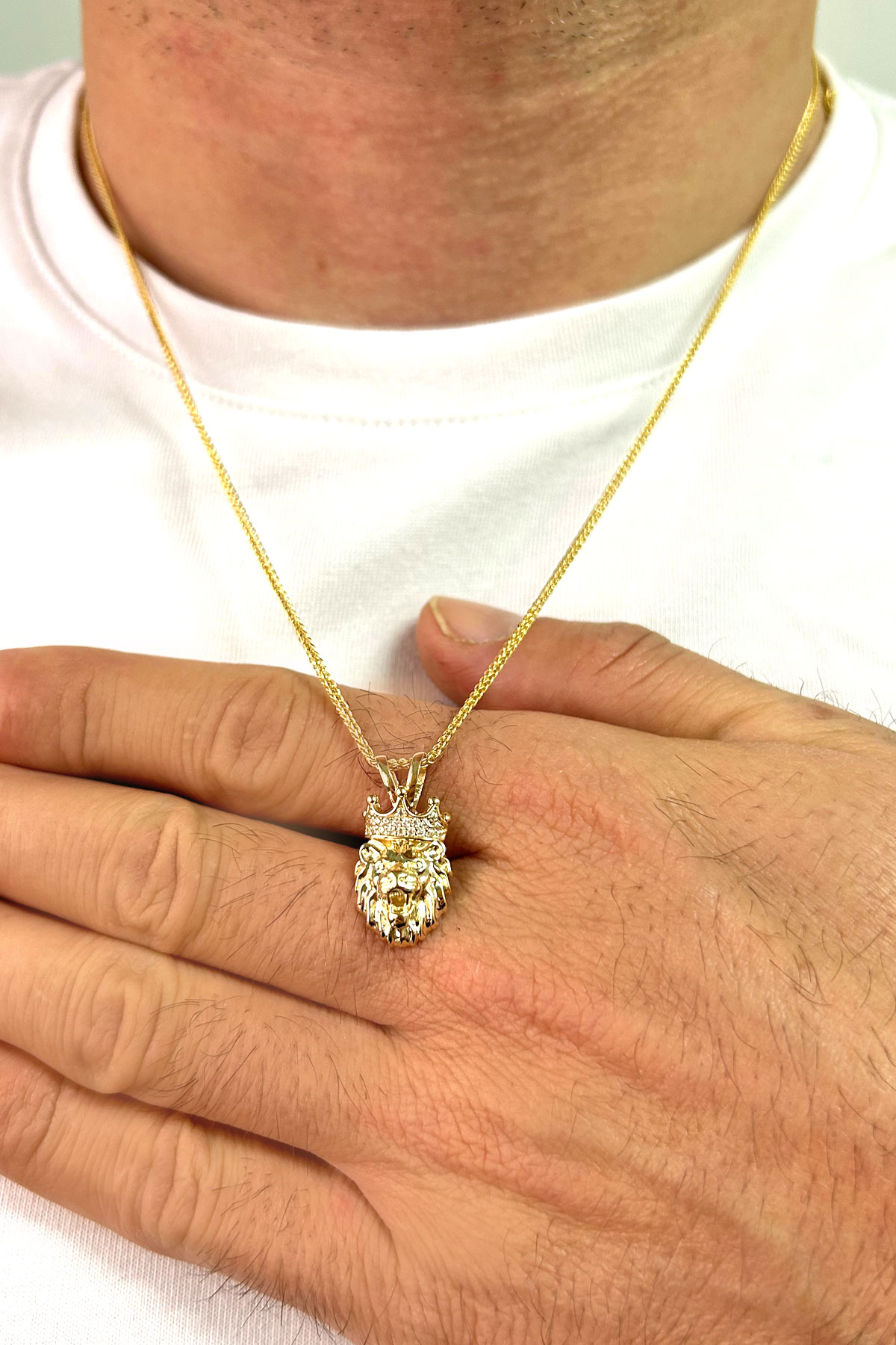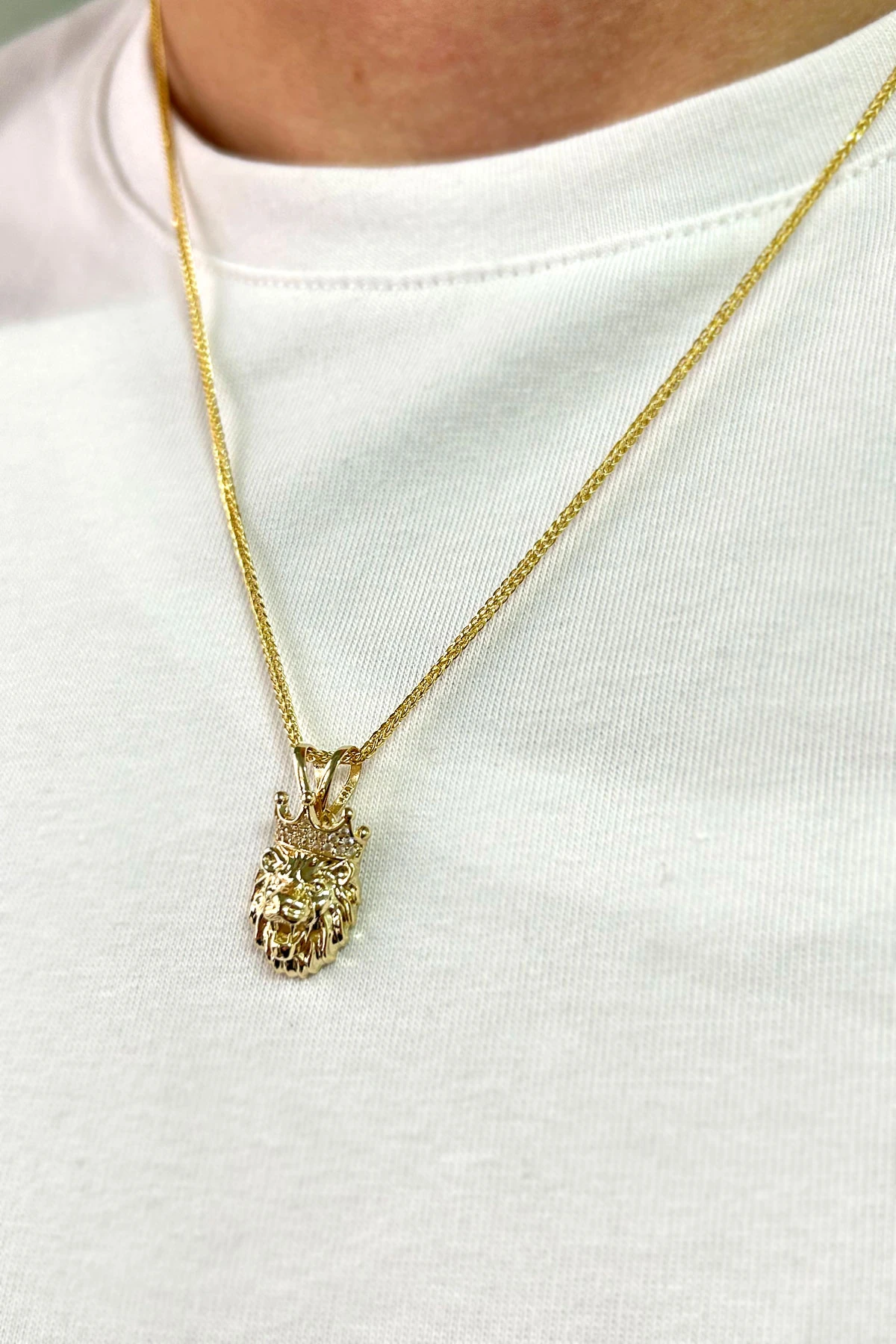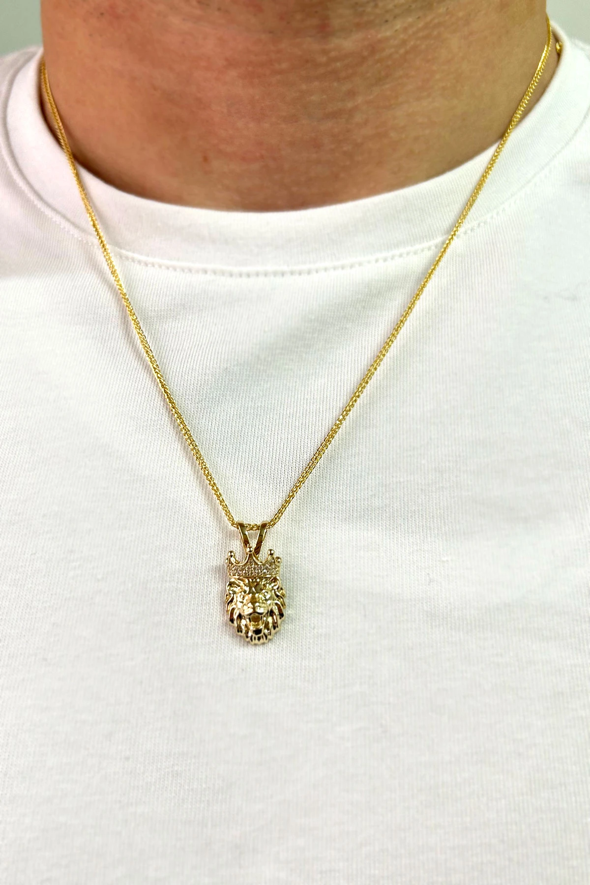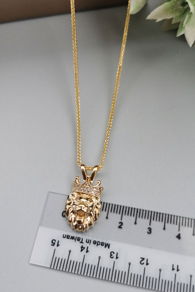 Modern Şehirli Tarz 60 Cm Boyunda Spiga Zinciri İle Oldukça Şık Bir Modele Sahip 5.30 Gr. Ağırlığında 14 Ayar Altın Beyaz Zirkon Taşlı Aslan Erkek Kolye.