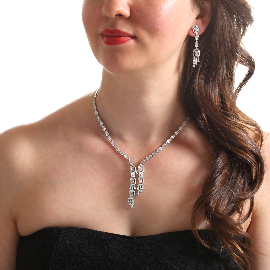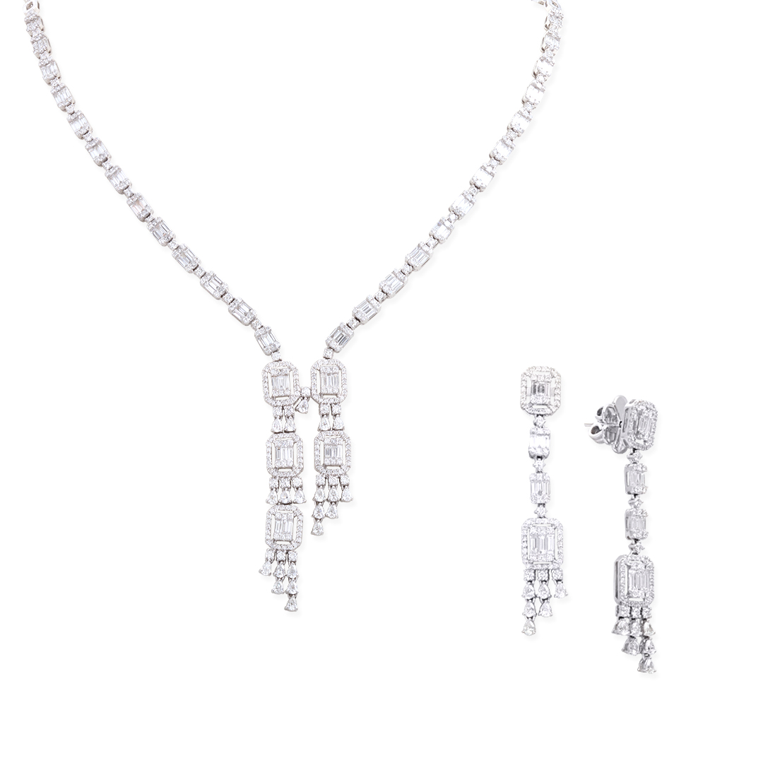 18 Ayar altın gösterişli baget model 41,15 gram ağırlığında F/SI kalite 10,38 ct pırlantalı küpe ve gerdanlıktan oluşan zarif ve modern tasarımlı düğün, nişan takı seti. Özel günlerinizde bir gün değil size bir ömür eşlik etsin..