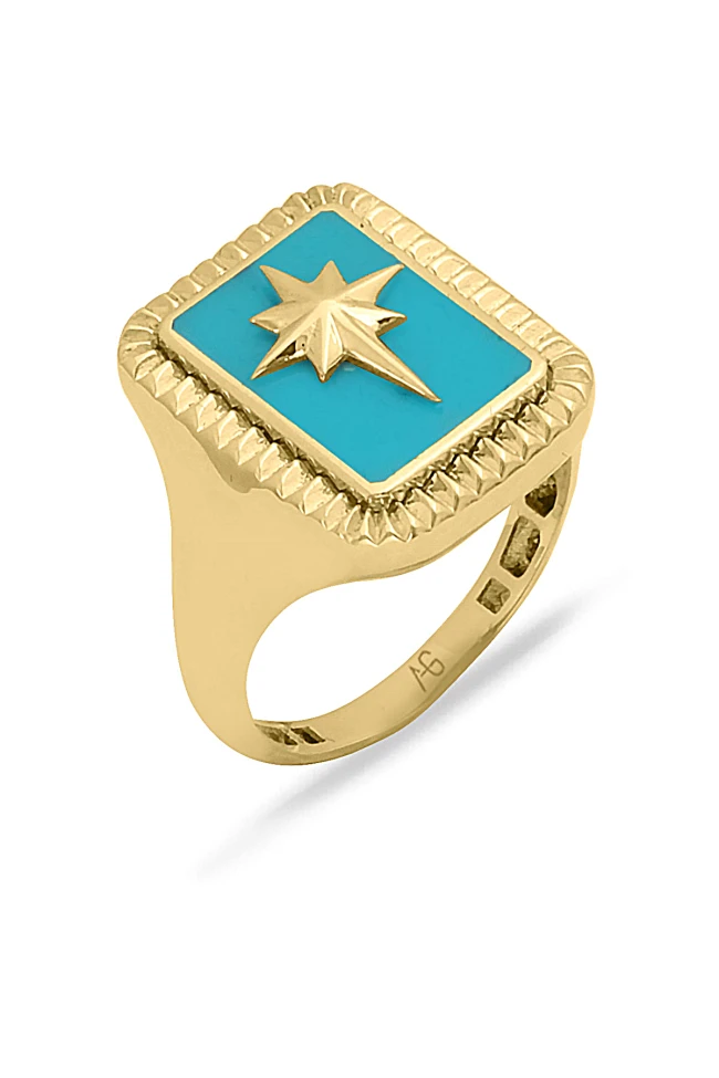 14 ayar sarı altın günlük kullanıma uygun 3.70 gram ağırlığında kuzey yıldızı detaylı mavi mineli dikdörtgen tasarım spor yüzük.
