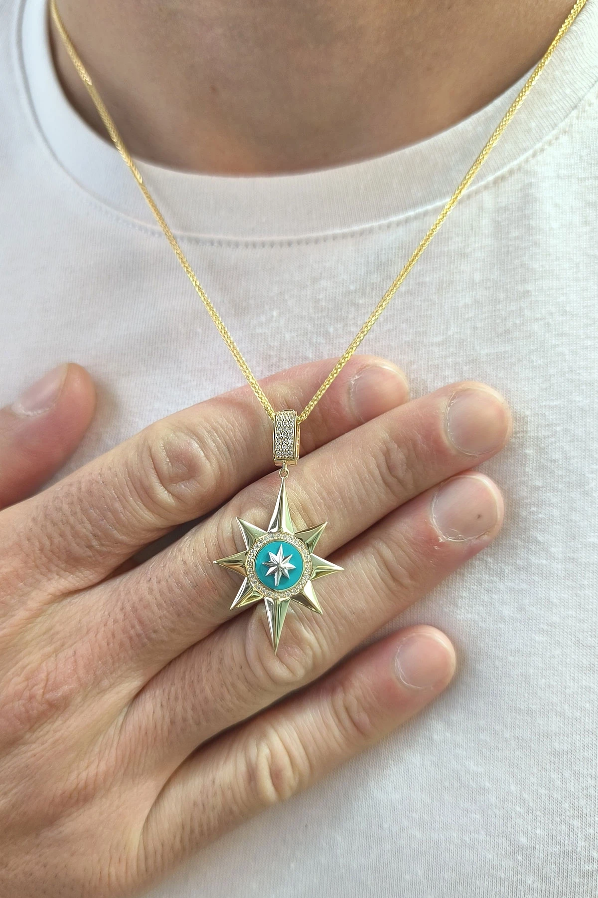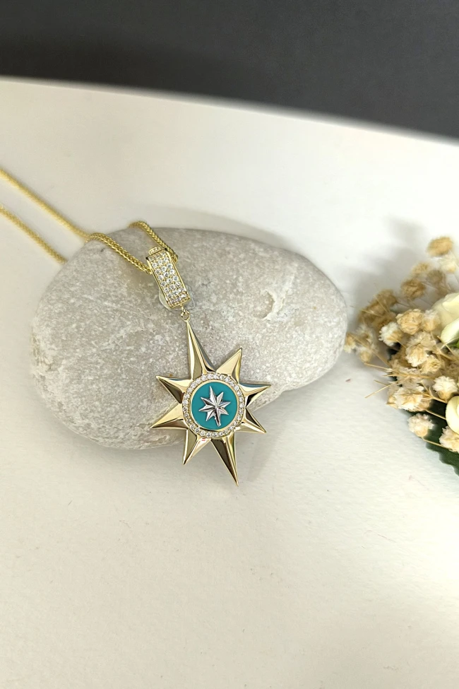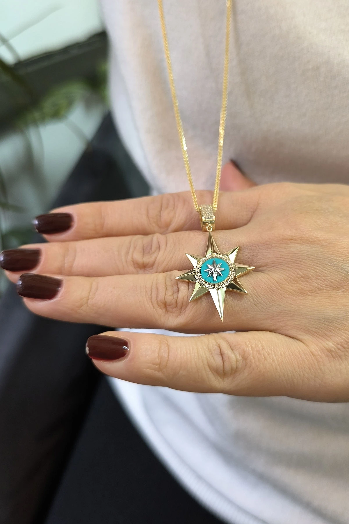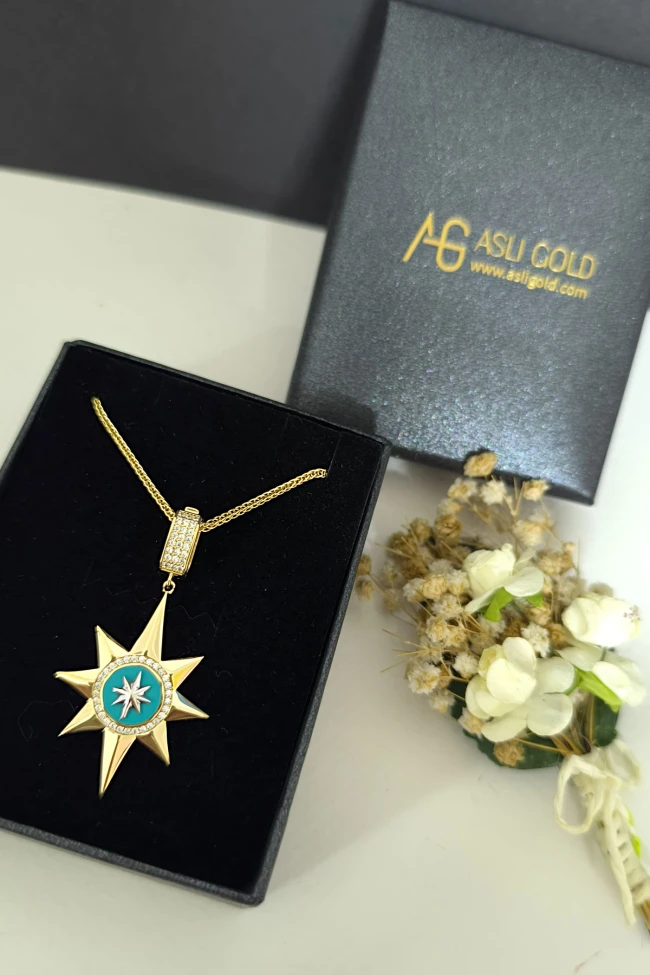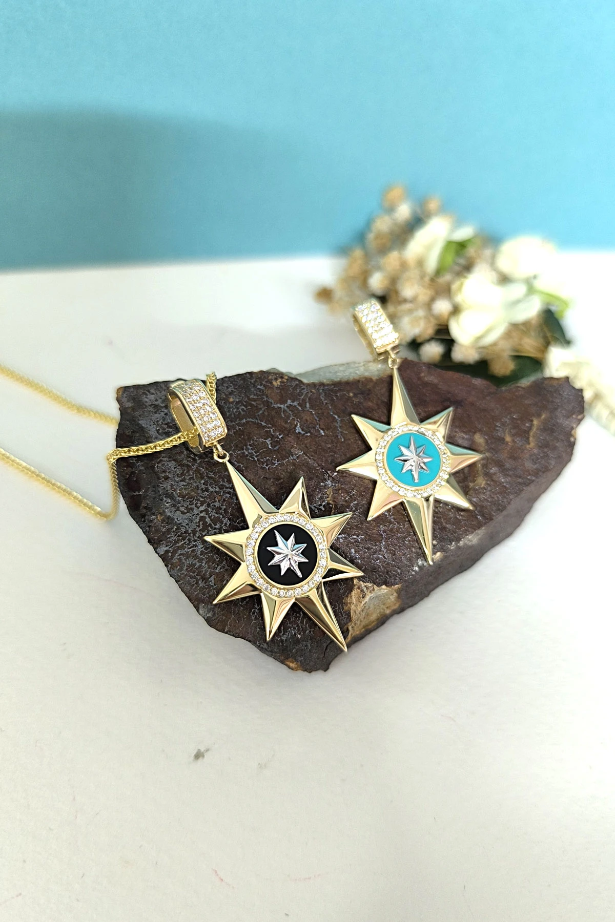 Spor Ve Modern Tarz Oldukça Şık Bir Modele Sahip 6.70 Gr. Ağırlığında 14 Ayar Altın Siyah Mineli Kuzey Yıldızı Model Unisex Kolye.