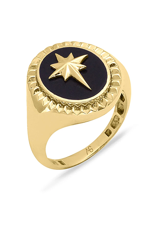 14 ayar sarı altın günlük kullanıma uygun 3.50 gram ağırlığında kuzey yıldızı detaylı siyah mineli oval tasarım spor yüzük.