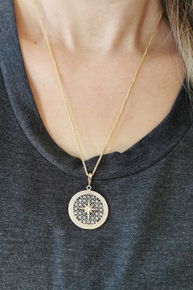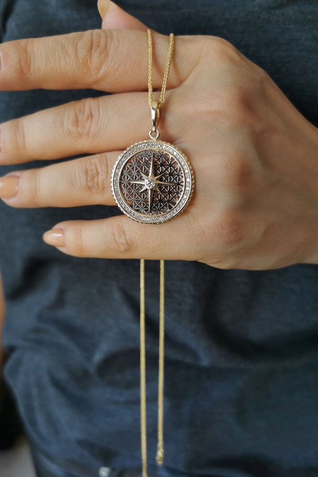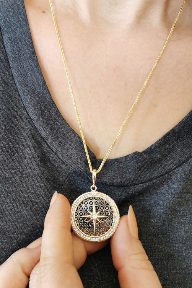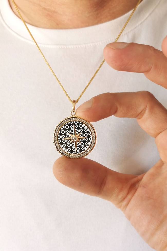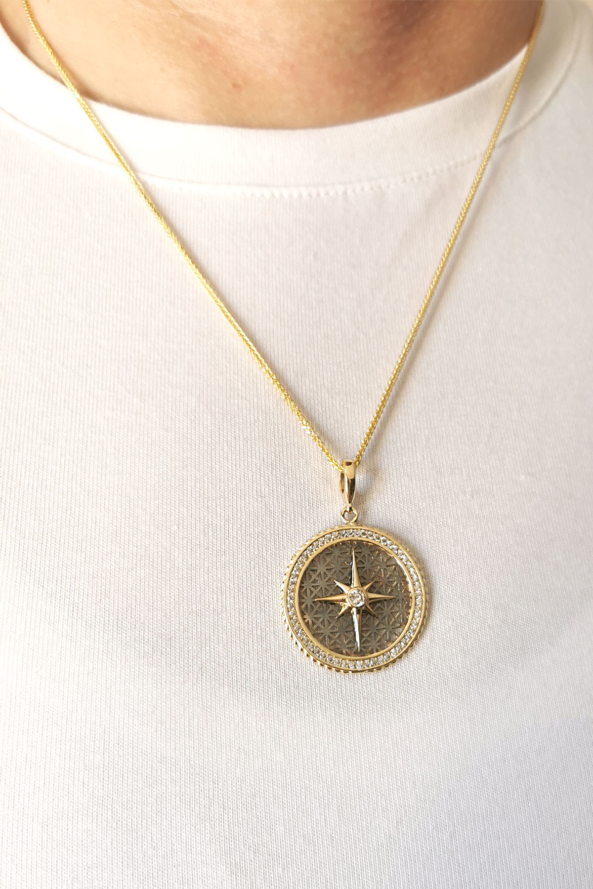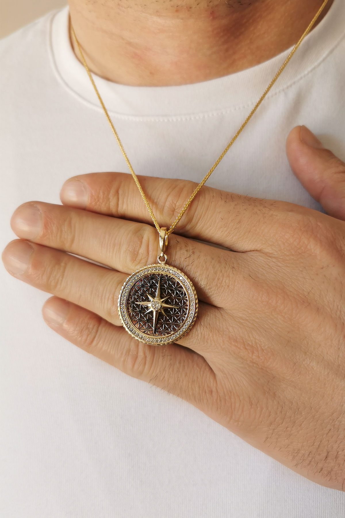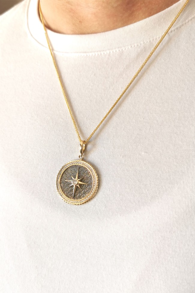 Farklı havaya sahip altı petek tasarımlı yuvarlak form 8.30 gr. 4 cm boyutunda kuzey yıldızı model 14 ayar altın unisex kolye.
