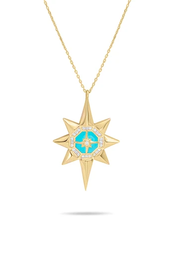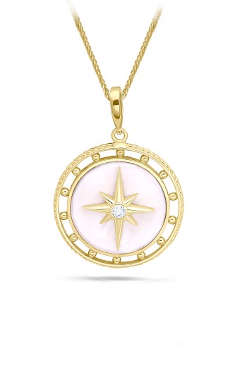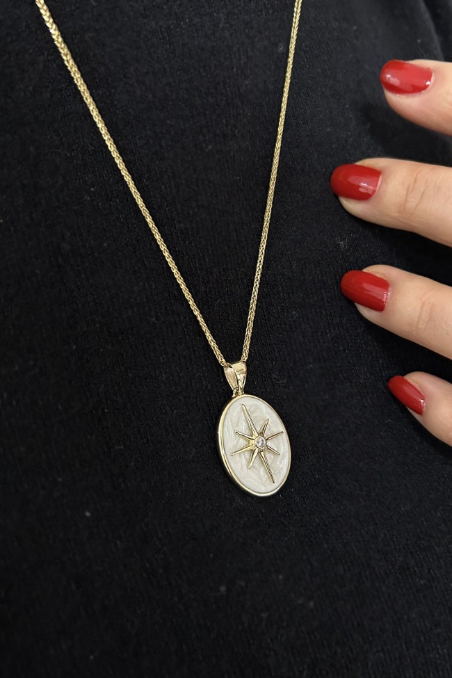 Farklı havaya sahip beyaz sedef mineli tasarım 7.30 gr. 3.5 cm boyutunda kuzey yıldızı model 14 ayar altın oval model madalyon kolye.