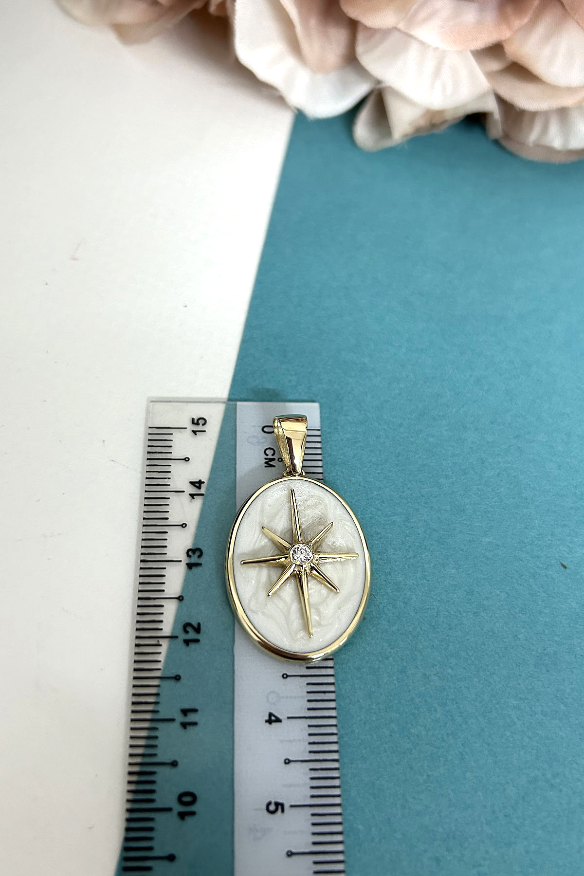 Farklı havaya sahip beyaz sedef mineli tasarım 5.30 gr. 3.5 cm boyutunda kuzey yıldızı model 14 ayar altın oval model madalyon kolye ucu.