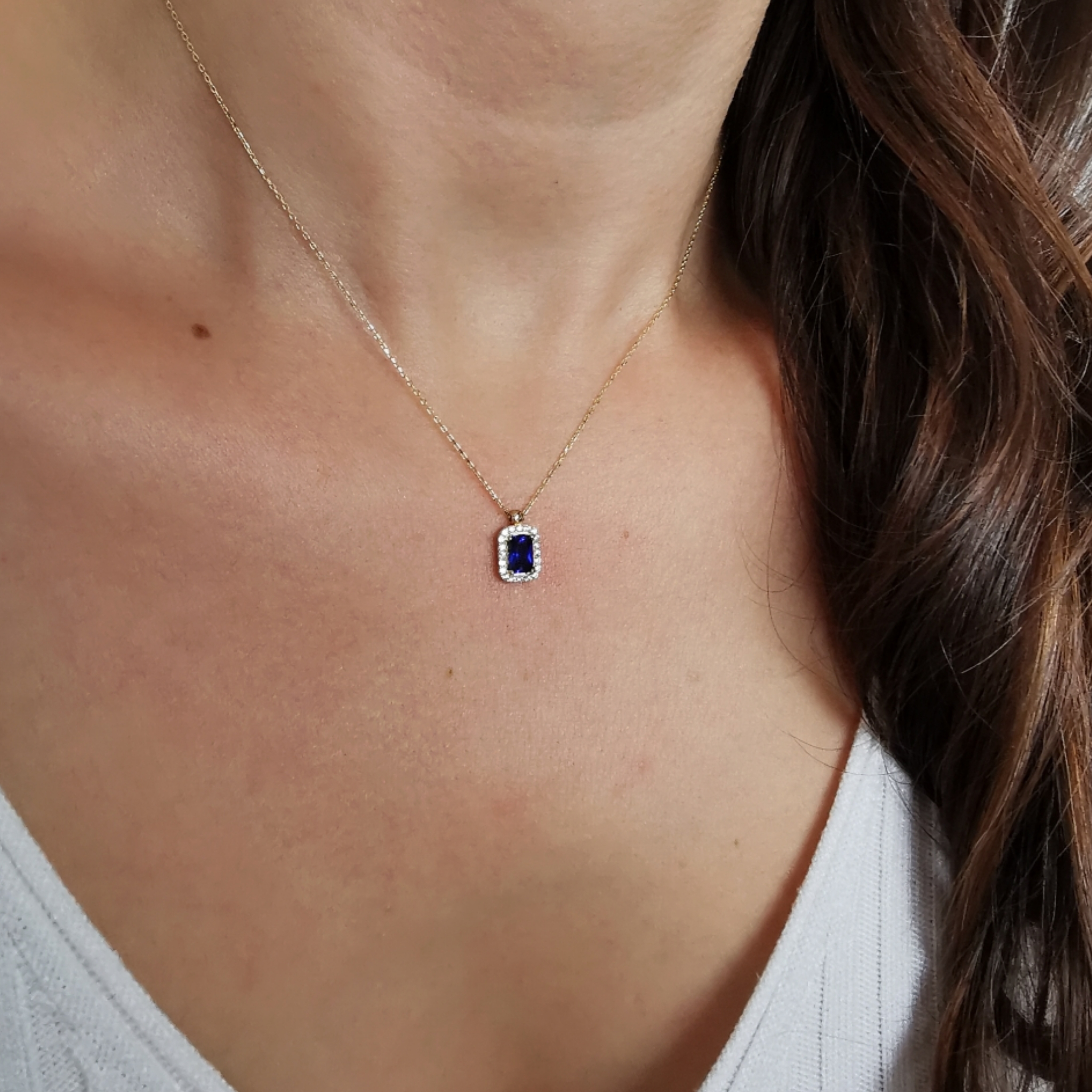 14 Ayar 1.75 gram ağırlığında 45 cm kendinden zincirli ve kenar detayları zirkon taşlı ortası lacivert baget taş tasarımıyla dikkat çekici şık ışıl ışıl minimal modern altın kolye.