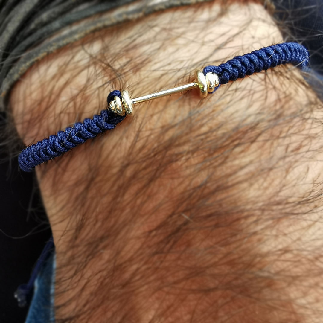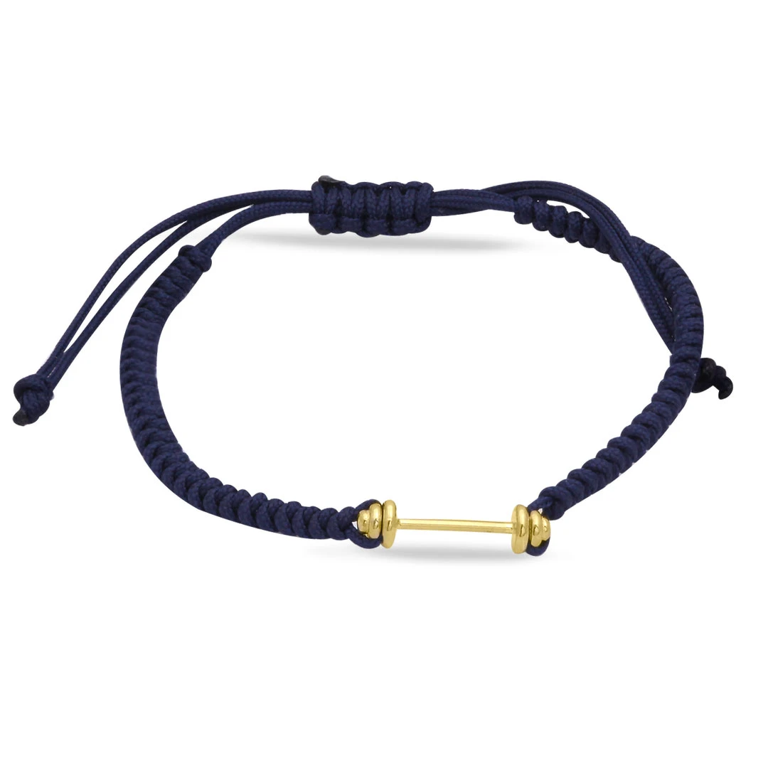 Dambıl detaylı tasarımı ile günlük olarak da kullanabileceğiniz, özel günlerinde sevdiklerinize şık bir hediye seçeneği olacak 1.20 gr ağırlığında 14 ayar altın taşsız lacivert özel örgü ip detaylı spor bileklik.