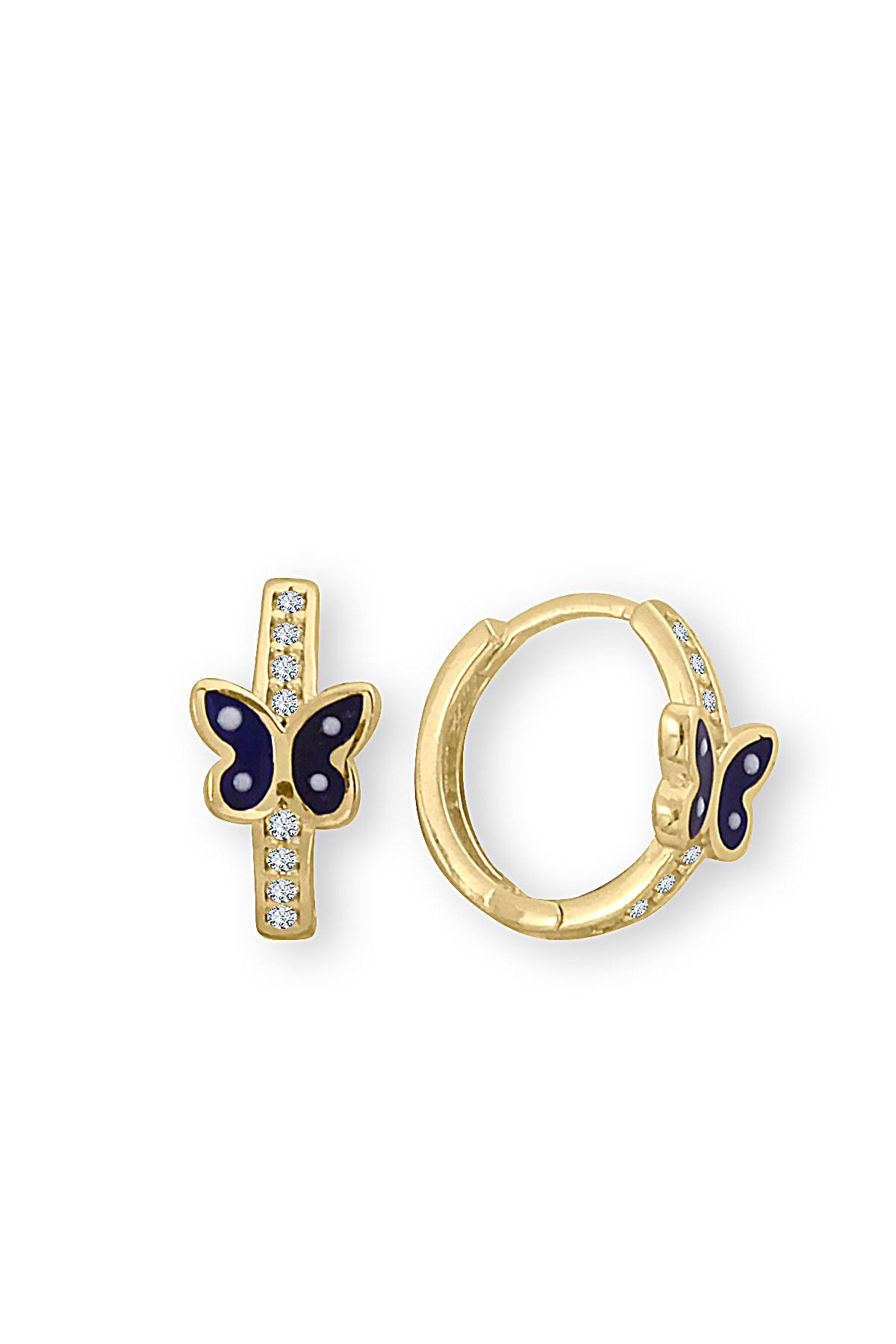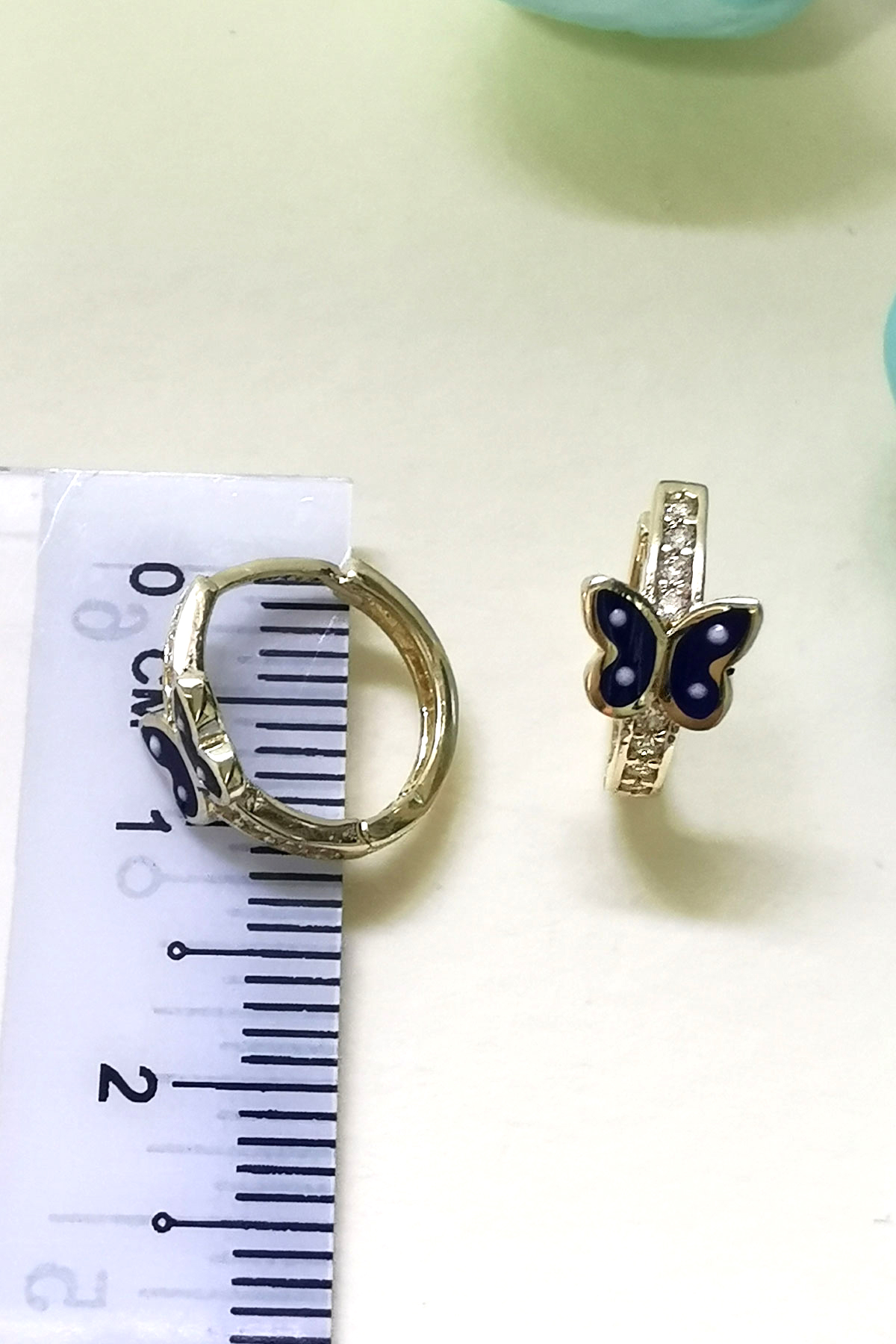 Minik prenseslere özel 1.2 Cm boyunda zirkon taşlı lacivert mineli kelebek model günlük olarak kullanıma uygun 14 ayar 1.60 gr ağırlığında altın klipsli çocuk küpesi.