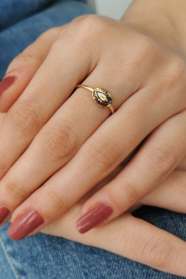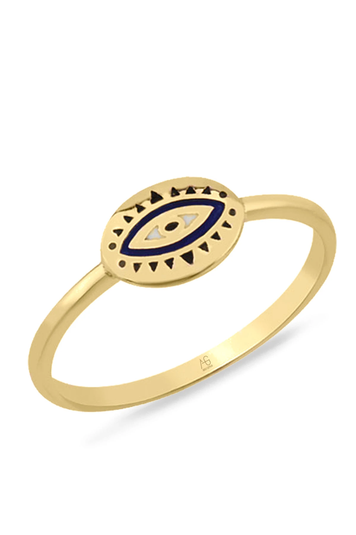 14 Ayar sarı altın taşsız lacivert mineli göz tasarımıyla günlük kullanıma uygun 1.40 gram ağırlığında minimal nazar yüzük.