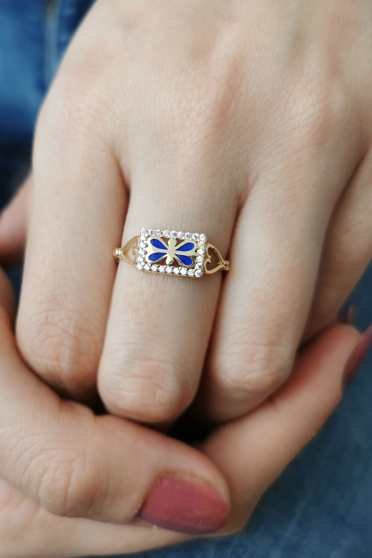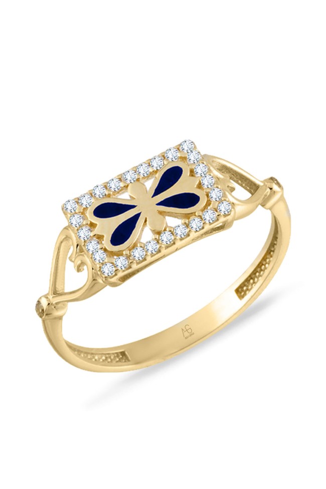 Lacivert mine detaylı kelebek model 14 ayar sarı altın tasarımıyla günlük kullanıma uygun 1.90 gram ağırlığında ışıltılı taş detaylı kadın yüzük.