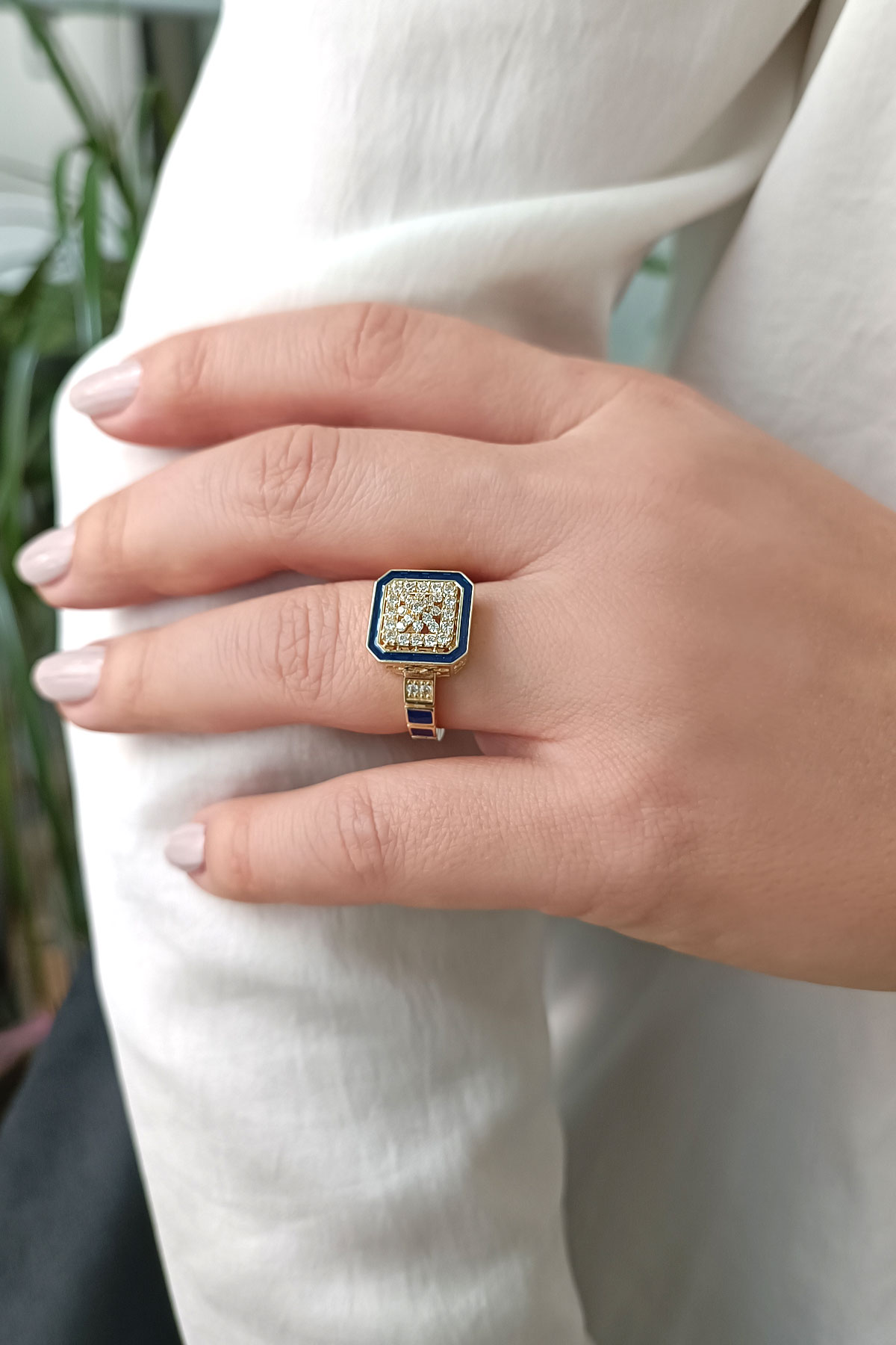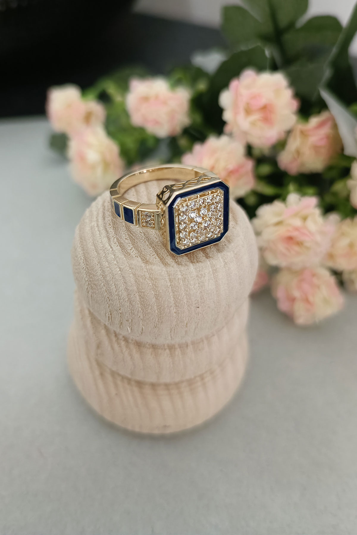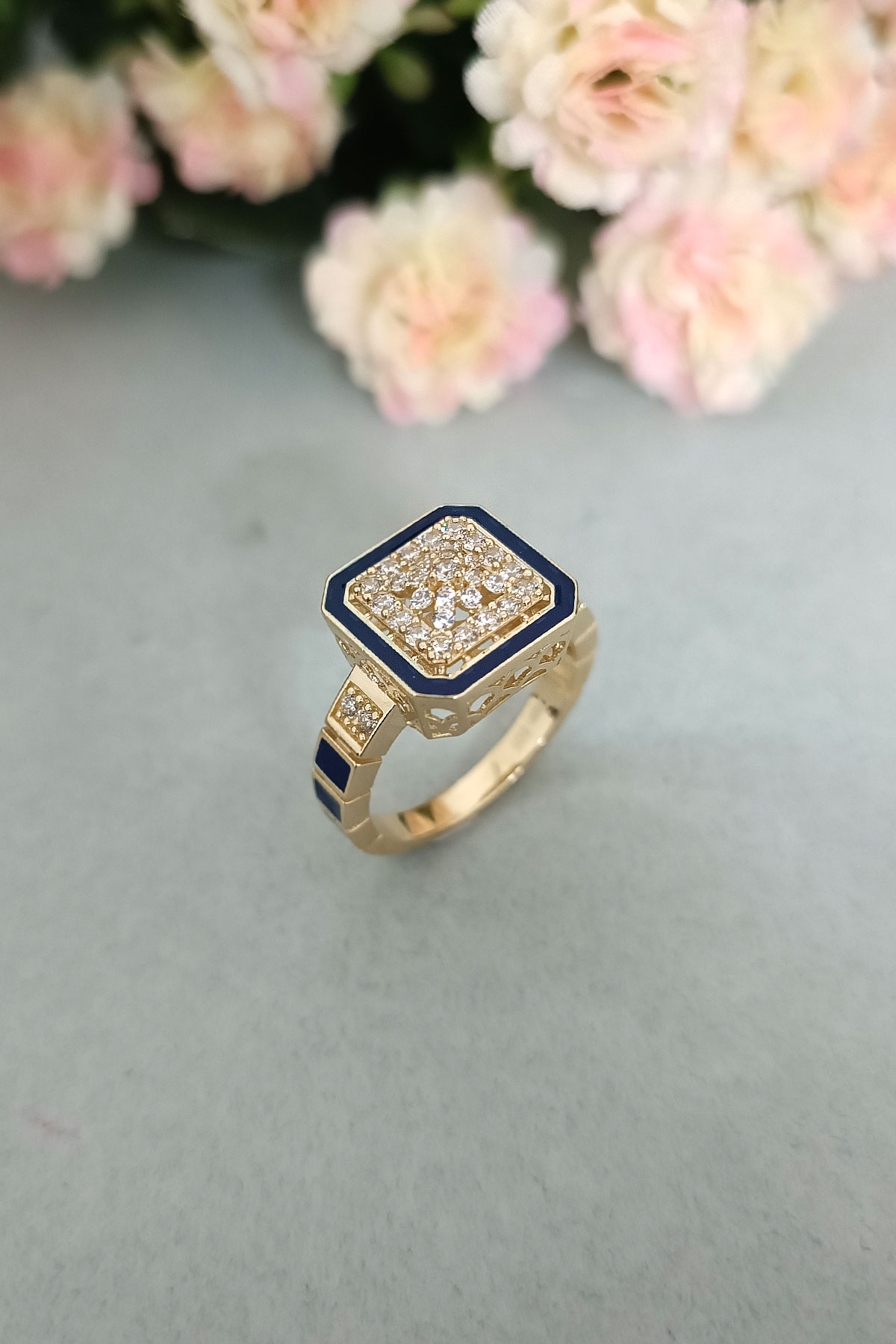 Lacivert mine detaylı zirkon taşlı model ışıl ışıl 14 ayar 4.60 gr ağırlığında harika bir duruşa sahip modern tasarım altın kare tasarım kadın yüzük.