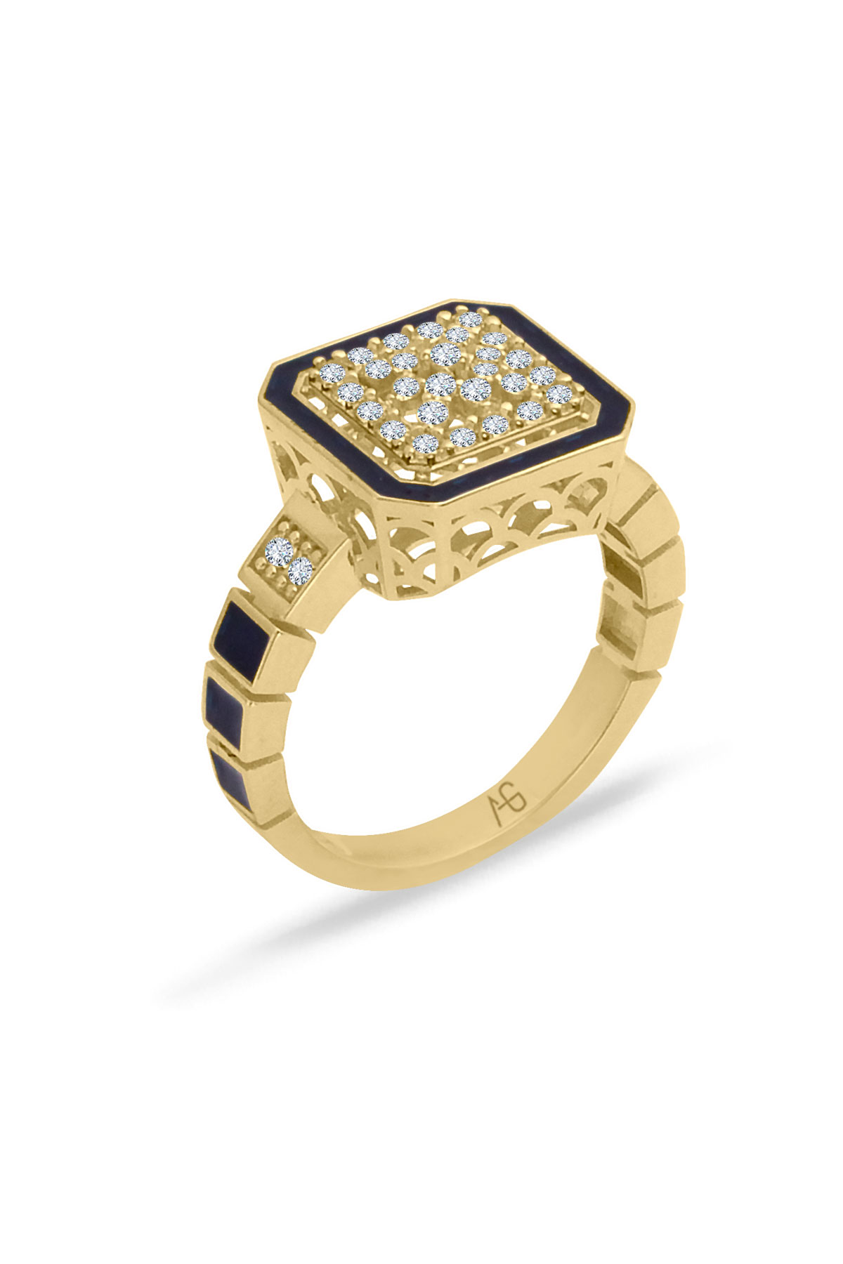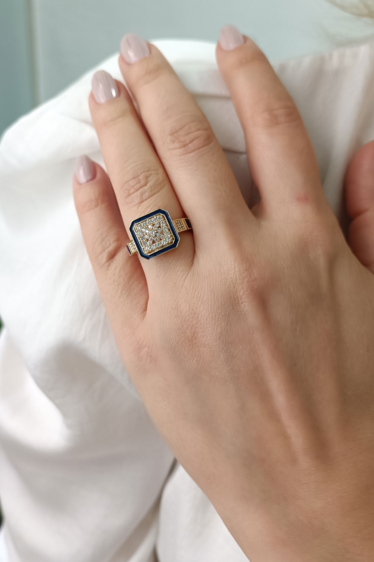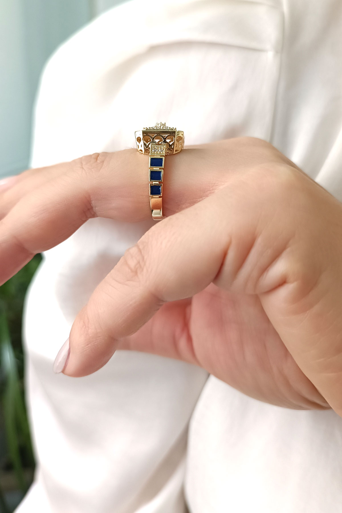 Lacivert mine detaylı zirkon taşlı model ışıl ışıl 14 ayar 4.60 gr ağırlığında harika bir duruşa sahip modern tasarım altın kare tasarım kadın yüzük.