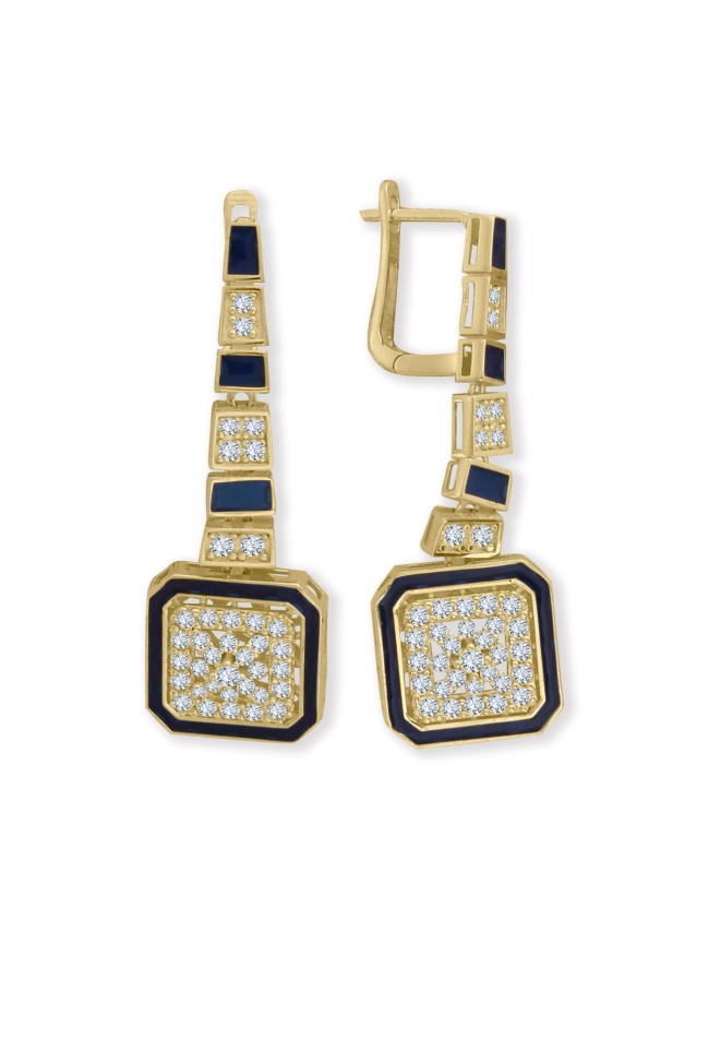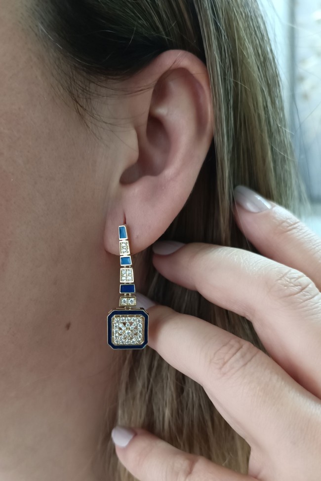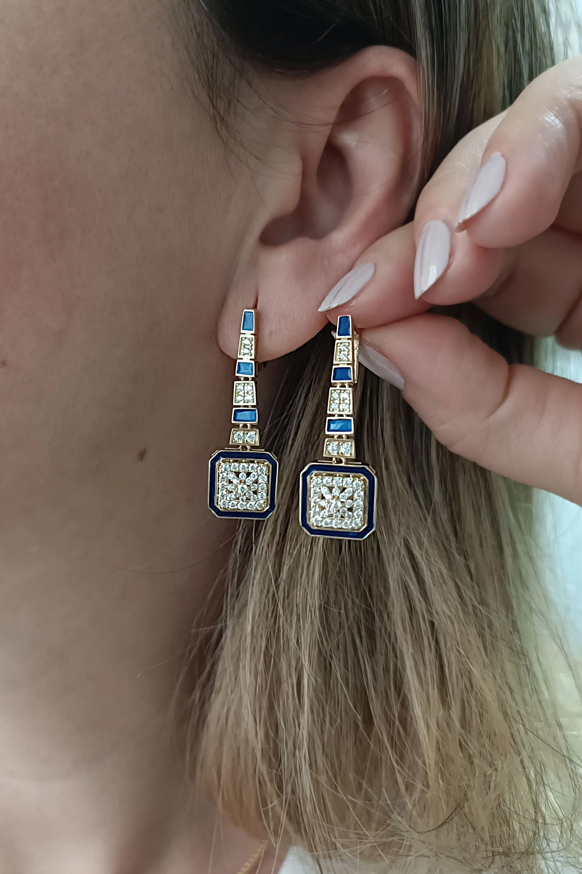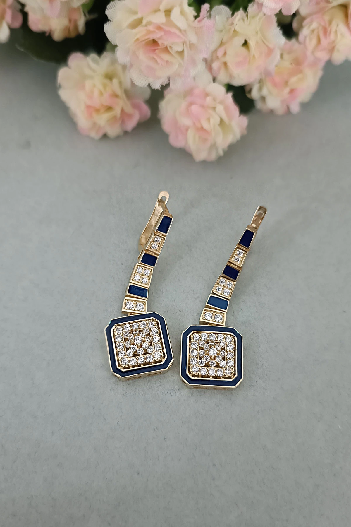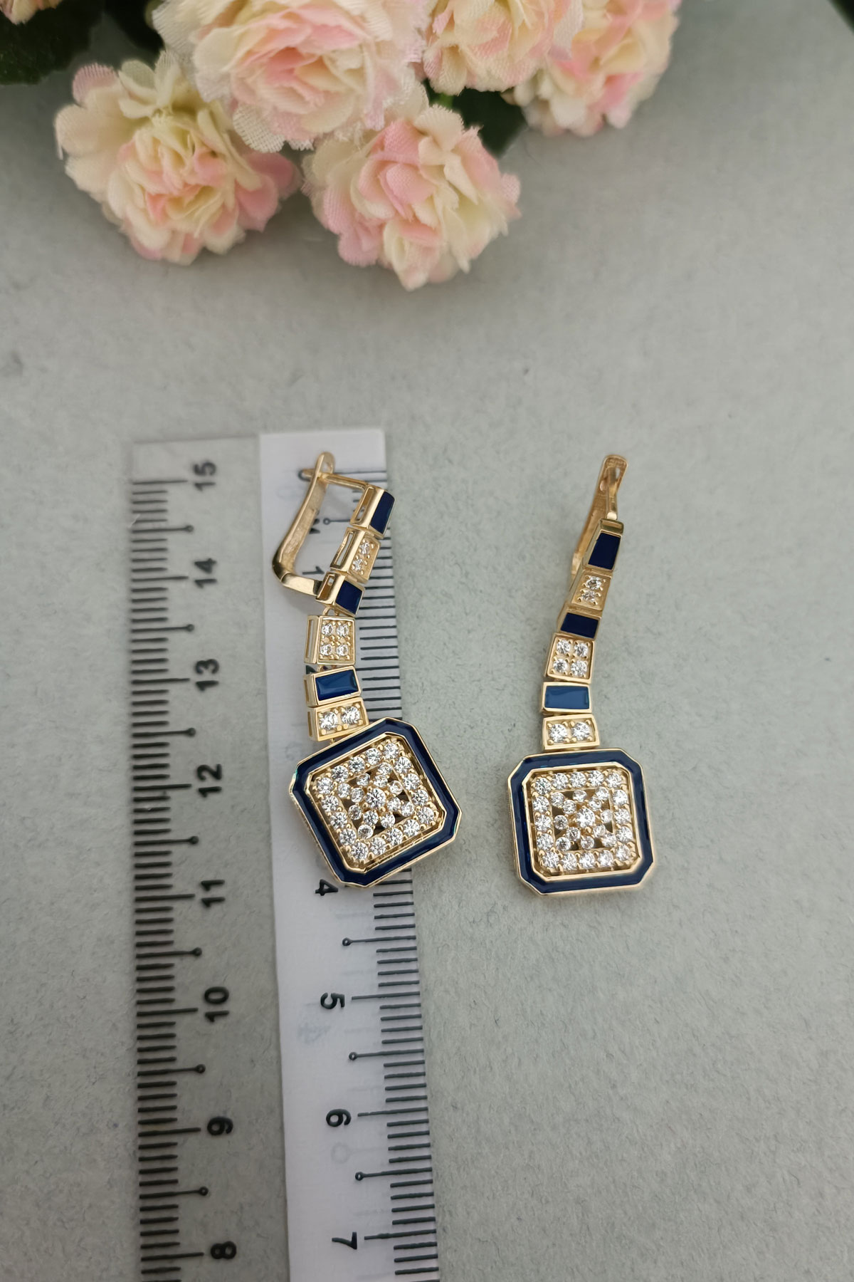 Lacivert mine detaylı zirkon taşlı model ışıl ışıl 14 ayar 6.30 gr ağırlığında harika bir duruşa sahip modern tasarım altın kare tasarım küpe.