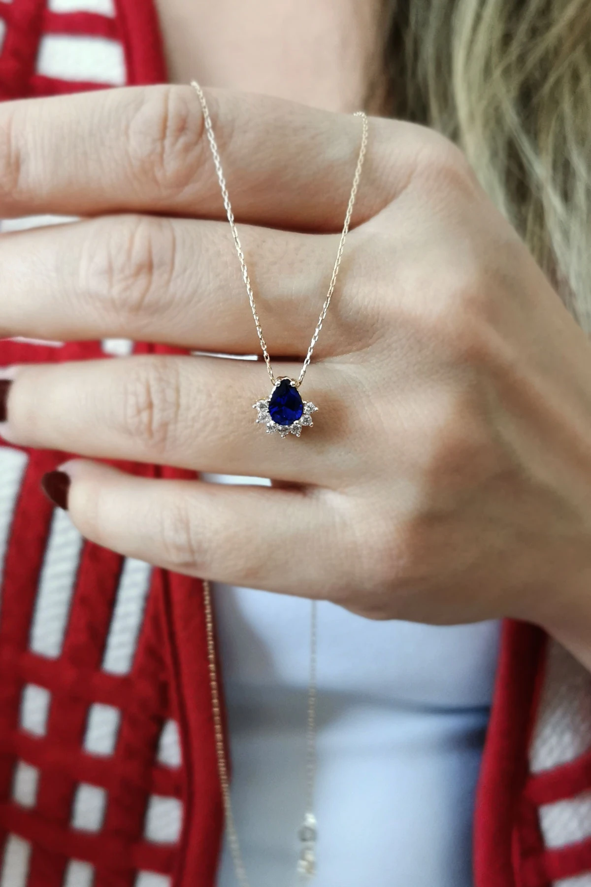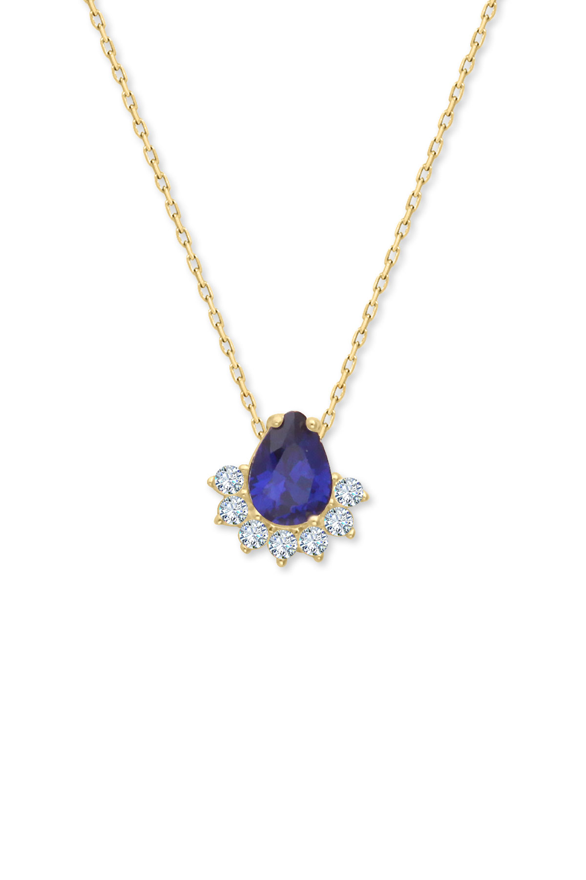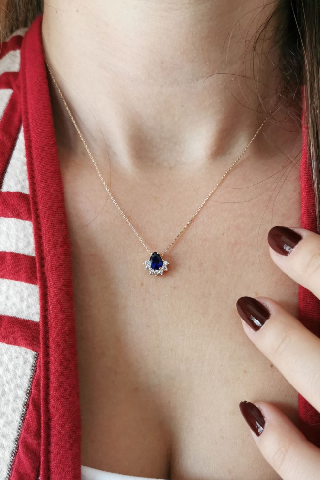 1.90 Gram Ağırlığında 1 Cm Boyutunda Lacivert Taşlı Minimal Altın Zarif Tasarım Damla Kolye.