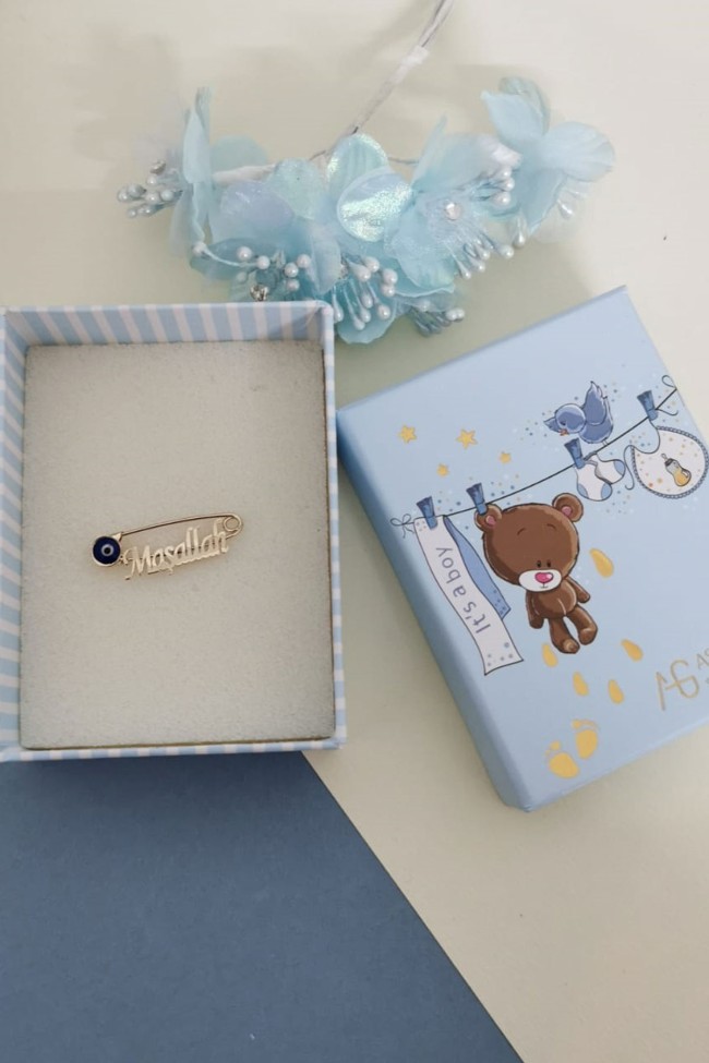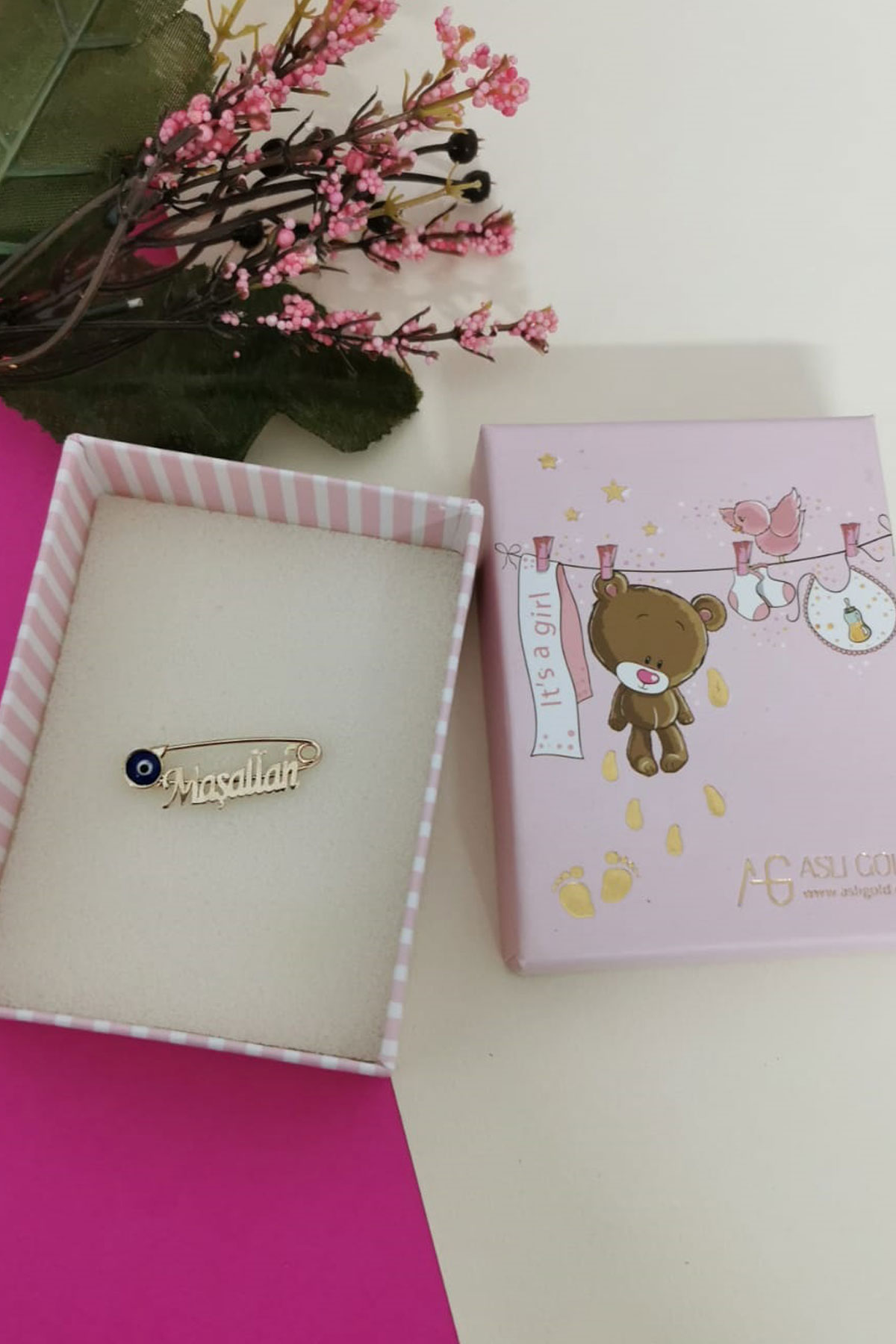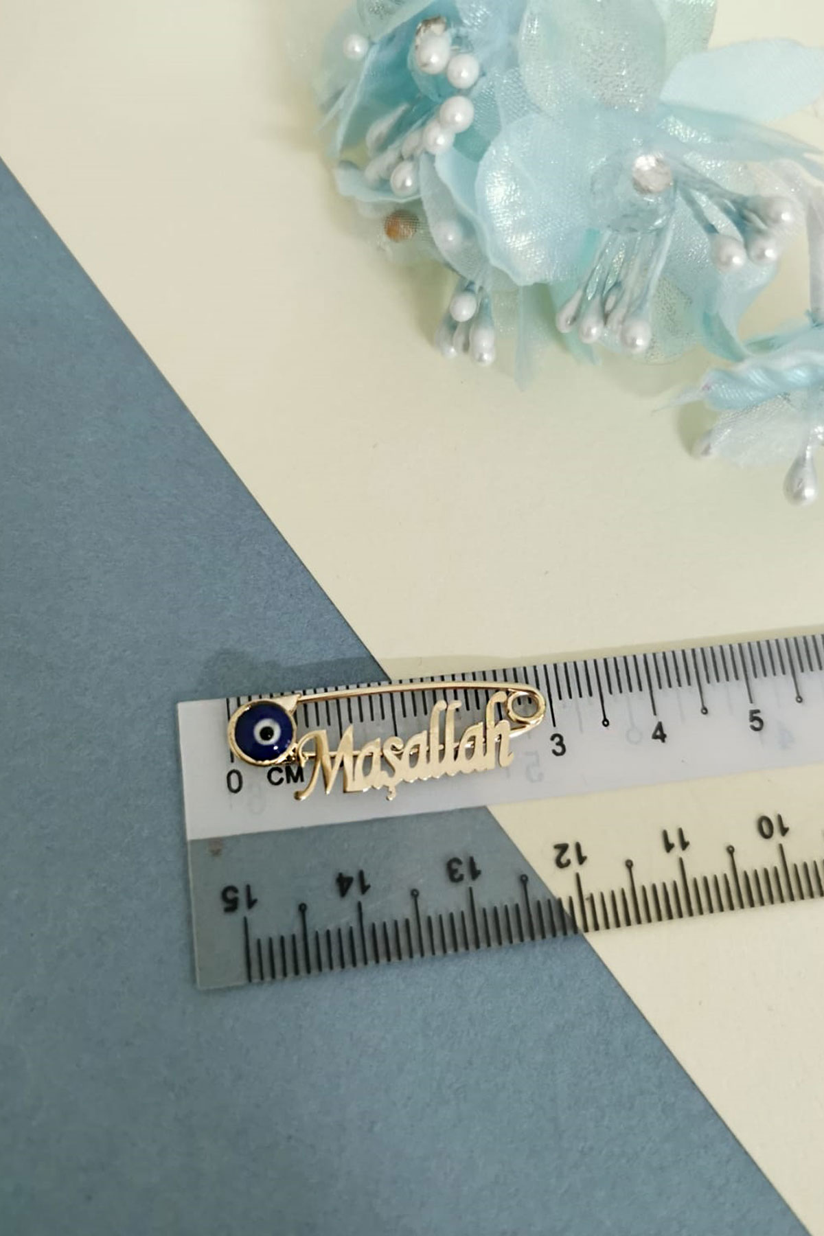 14 ayar 1.45 gr ağırlığında kilidi nazar boncuğu detaylı maşallah yazılı altın bebek iğnesi.