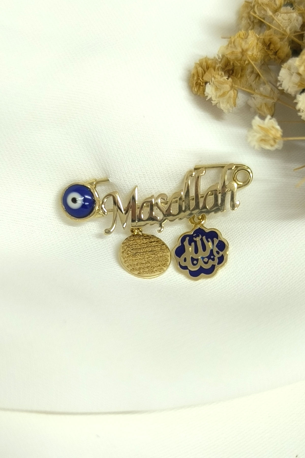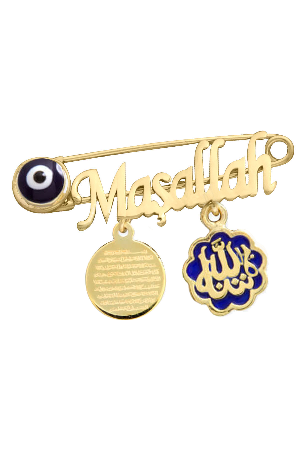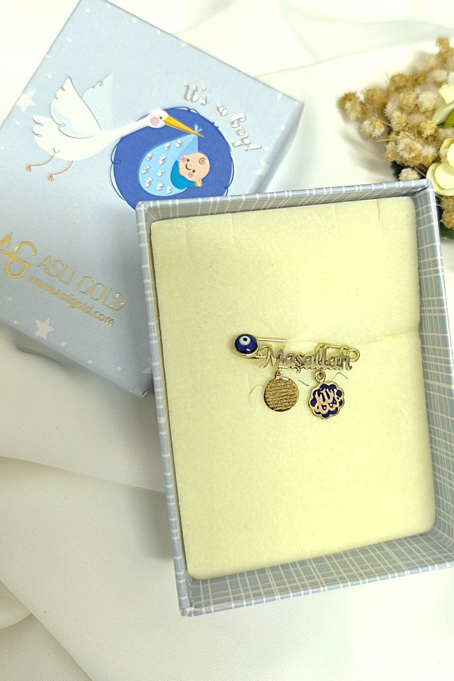 14 ayar 1.90 gr ağırlığında Maşallah yazılı bebek altın omuz iğnesi.