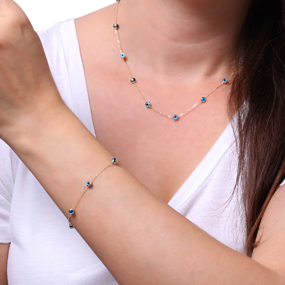 5 Gram 14 Ayar Mavi Göz Boncuklu Spor Günlük Kullanıma Uygun İkili Bileklik ve Kolye Takım. Kendinize yada sevdiklerinize armağan edebileceğiniz bu şık ve trend model tasarım her zaman severek kullanılacak.