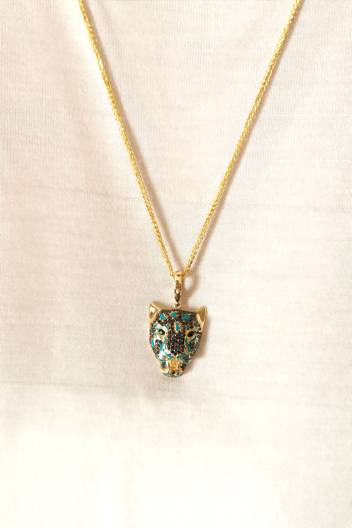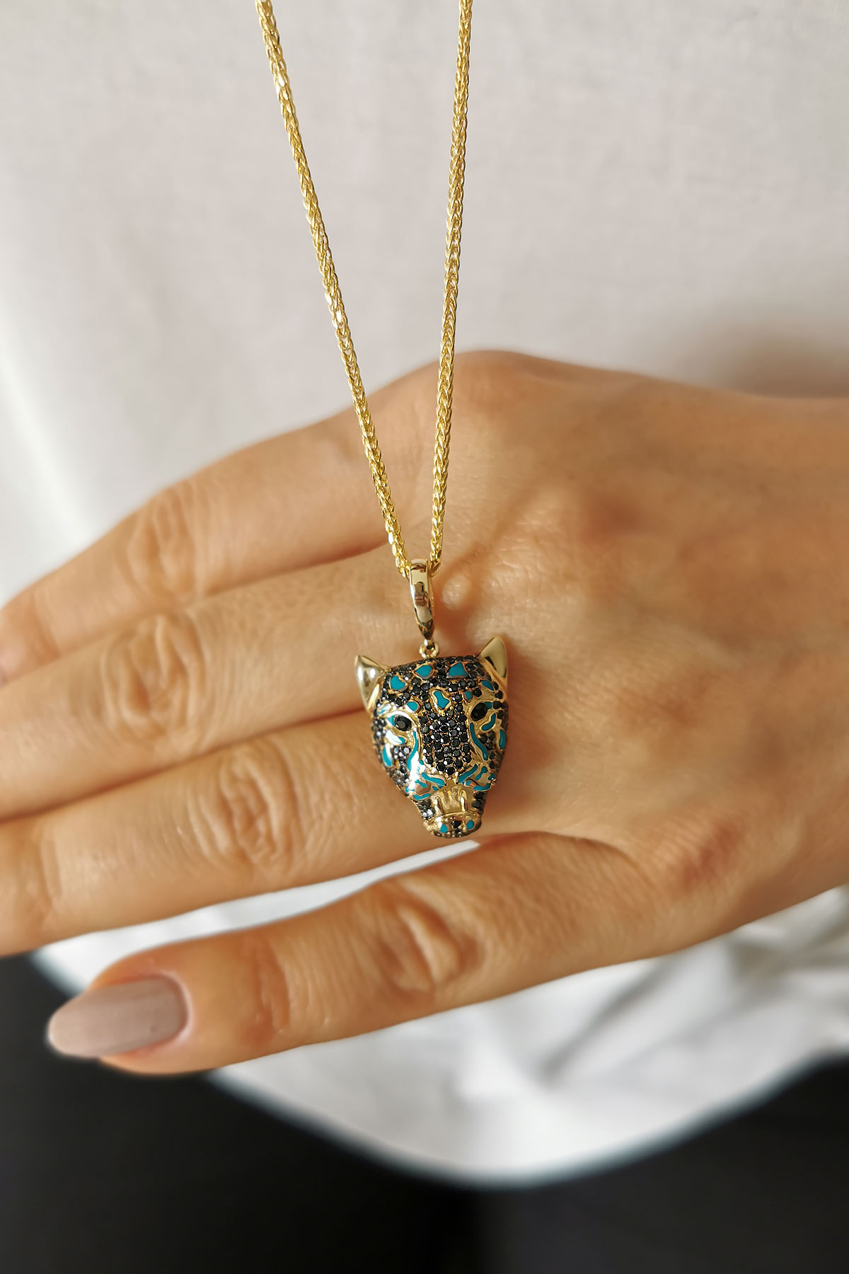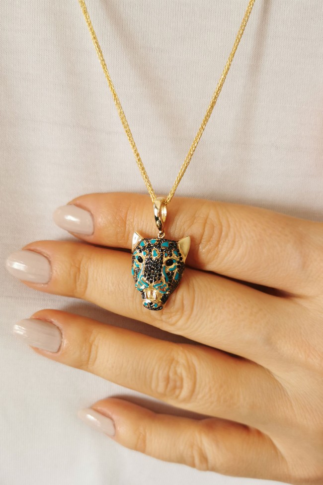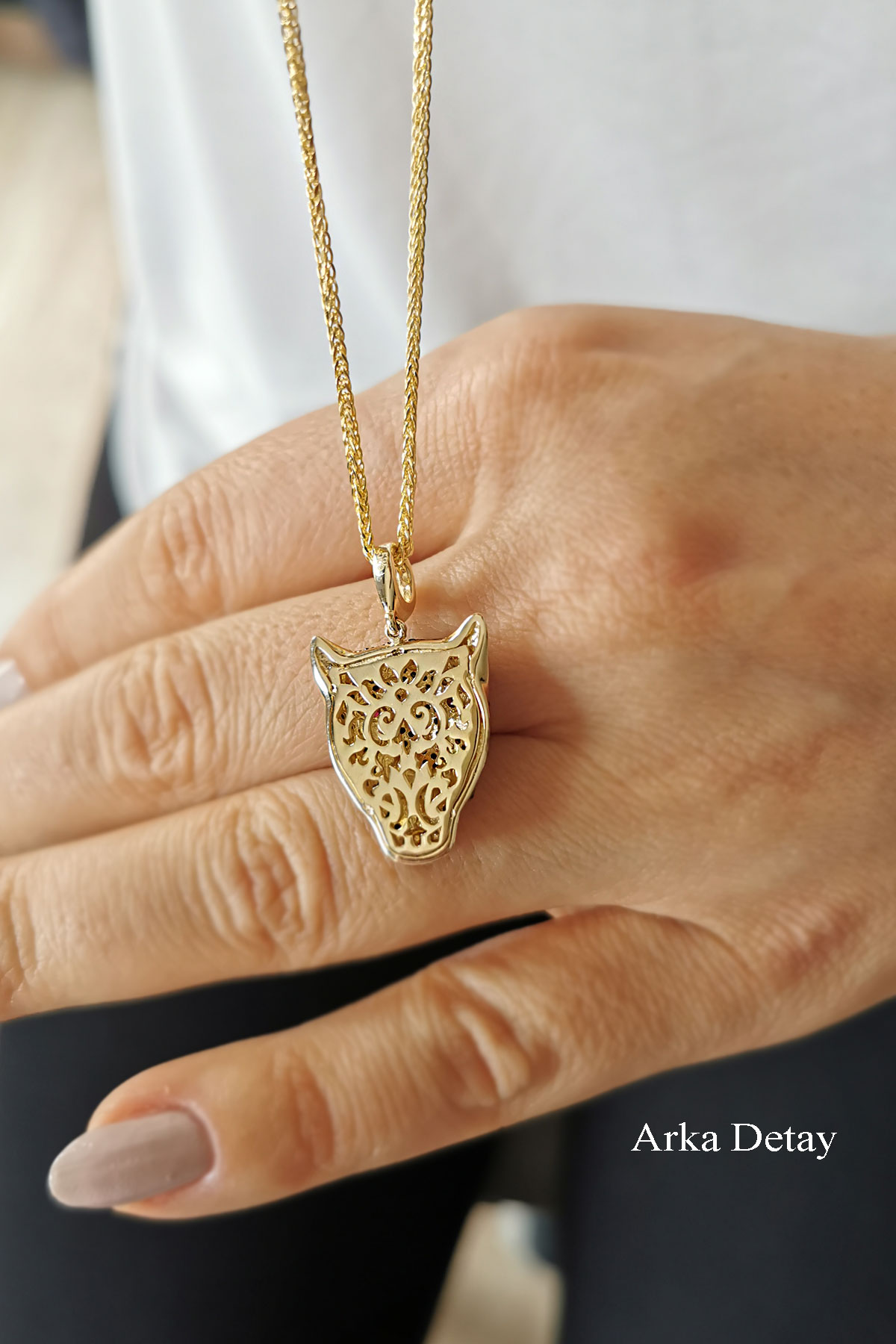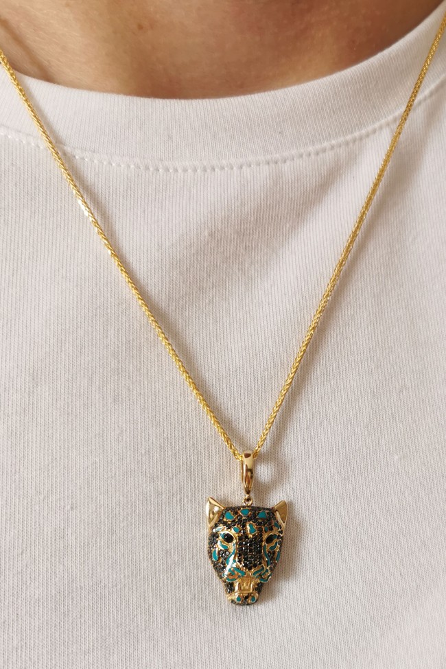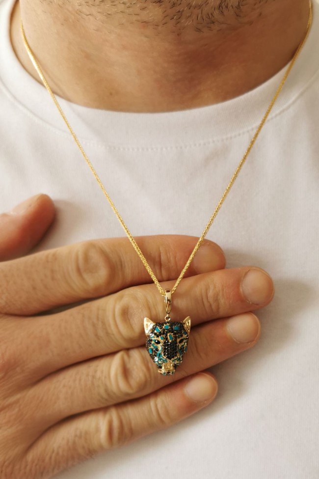 7.60 gr. 3 cm boyutunda spiga zincirli kaplan başı model 14 ayar arkası otantik desenli altın taşlı şık unisex kolye.