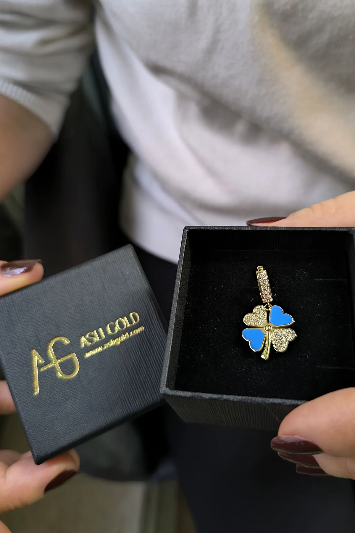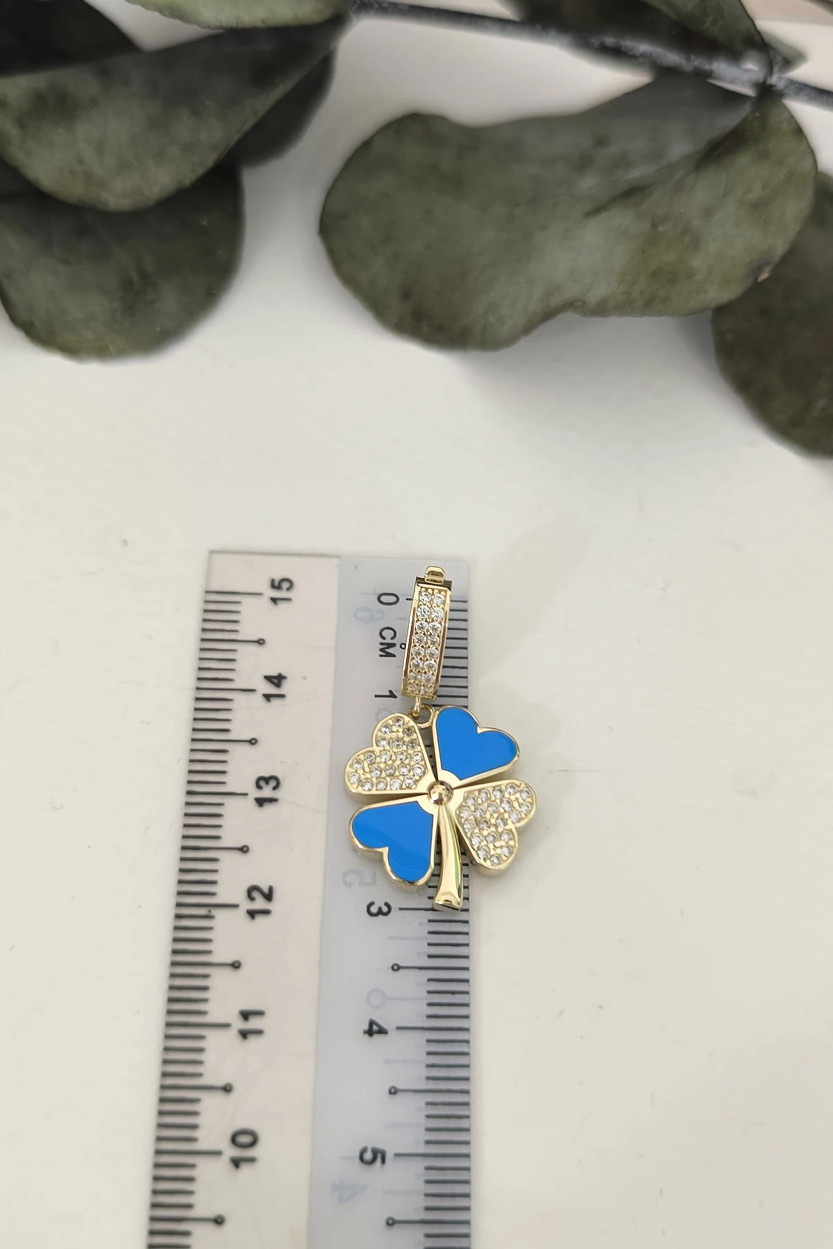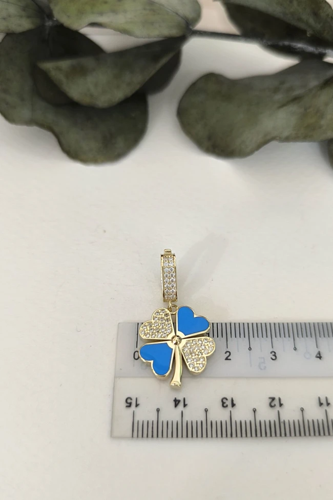 3.50 gr. 3 cm boyutunda zirkon taşlı model 14 ayar altın mavi mineli yonca model charm kilit kolye ucu. Farklı kolyelerinizle bir arada kombine olarak kullanabileceğiniz harika ve gösterişli bir model.