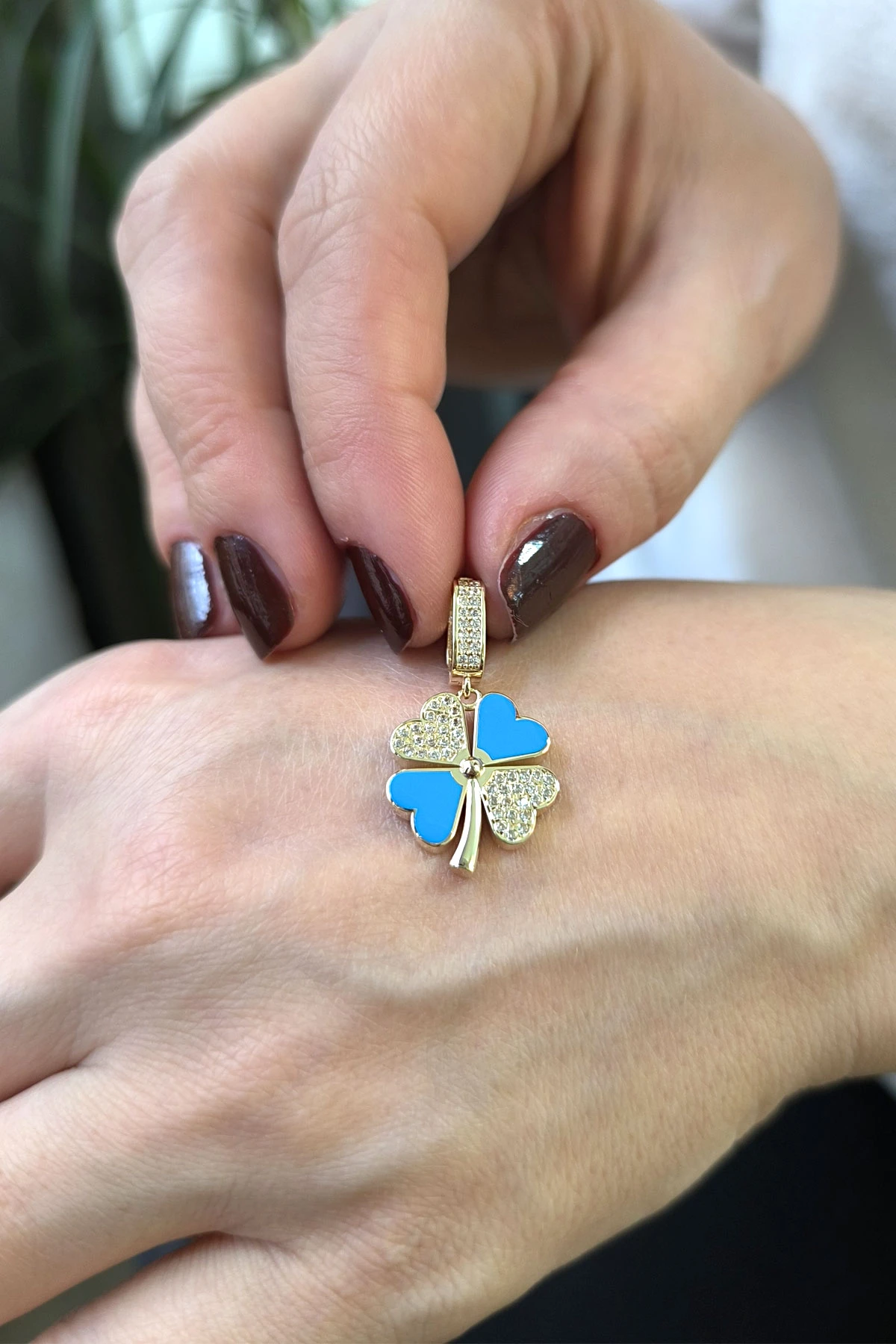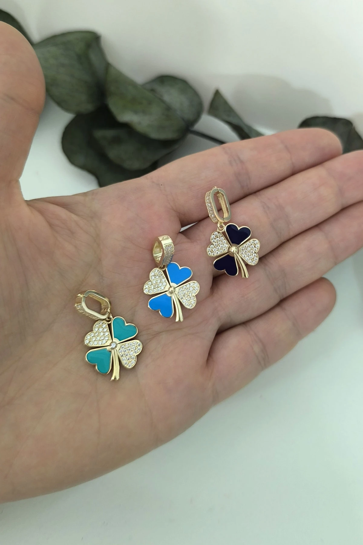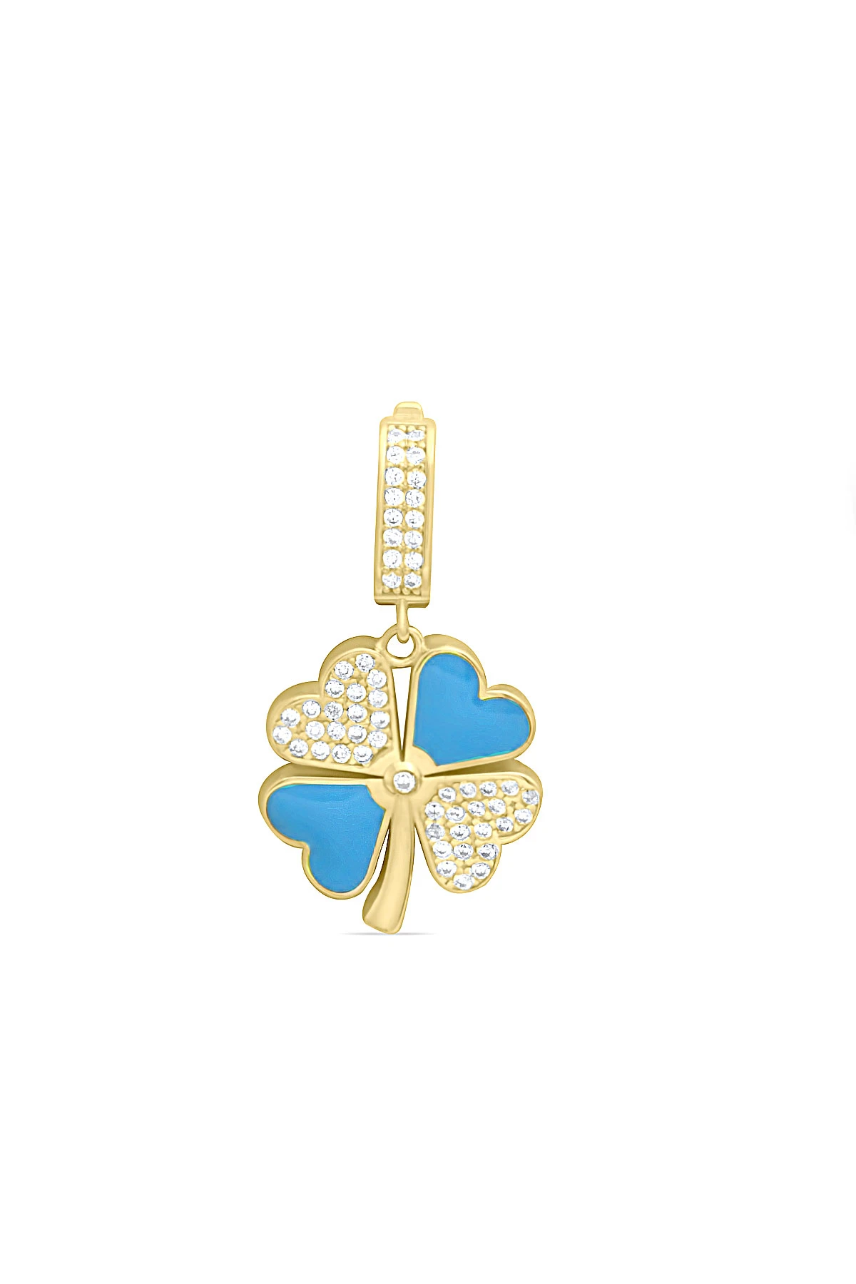3.50 gr. 3 cm boyutunda zirkon taşlı model 14 ayar altın mavi mineli yonca model charm kilit kolye ucu. Farklı kolyelerinizle bir arada kombine olarak kullanabileceğiniz harika ve gösterişli bir model.