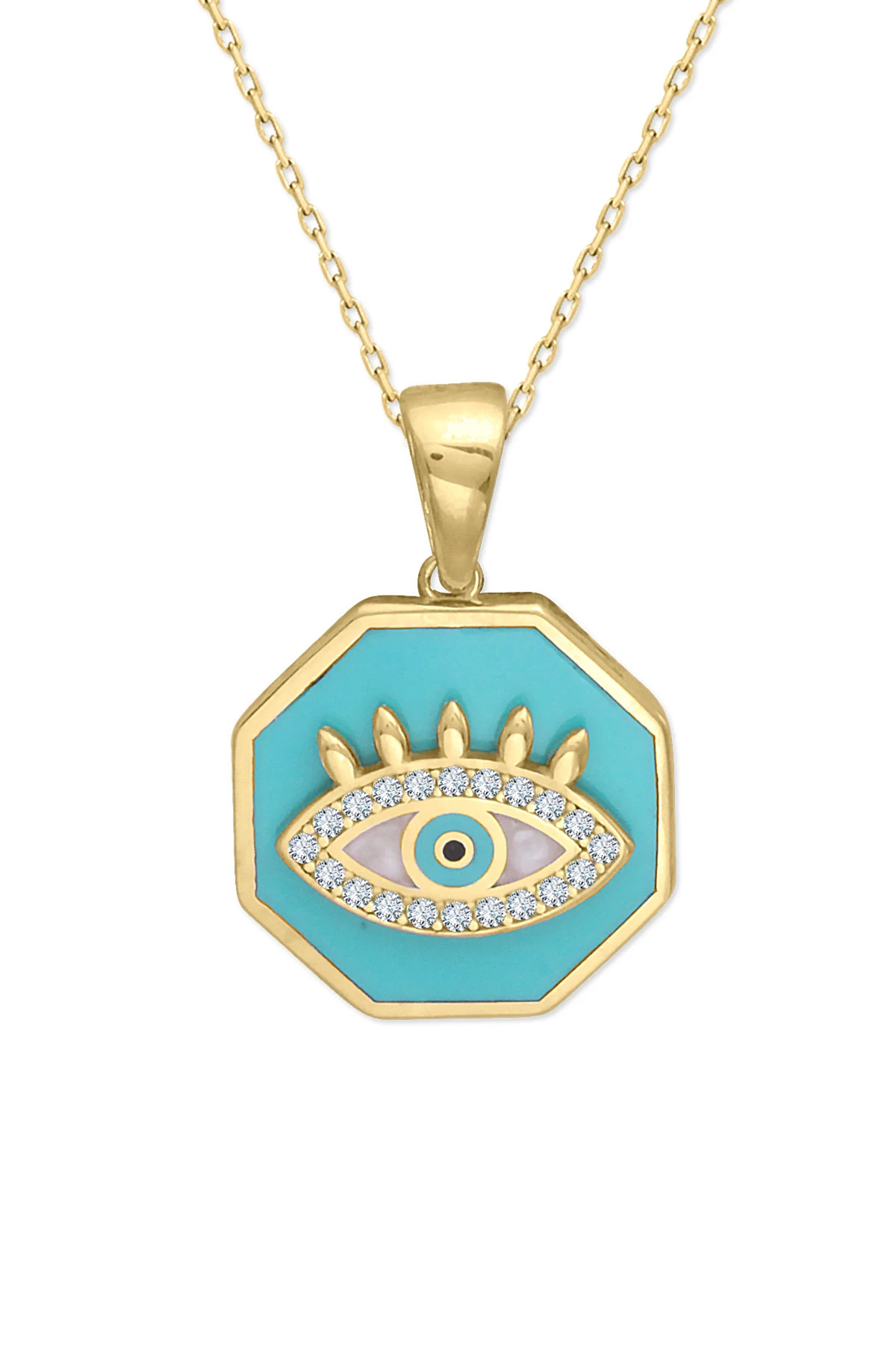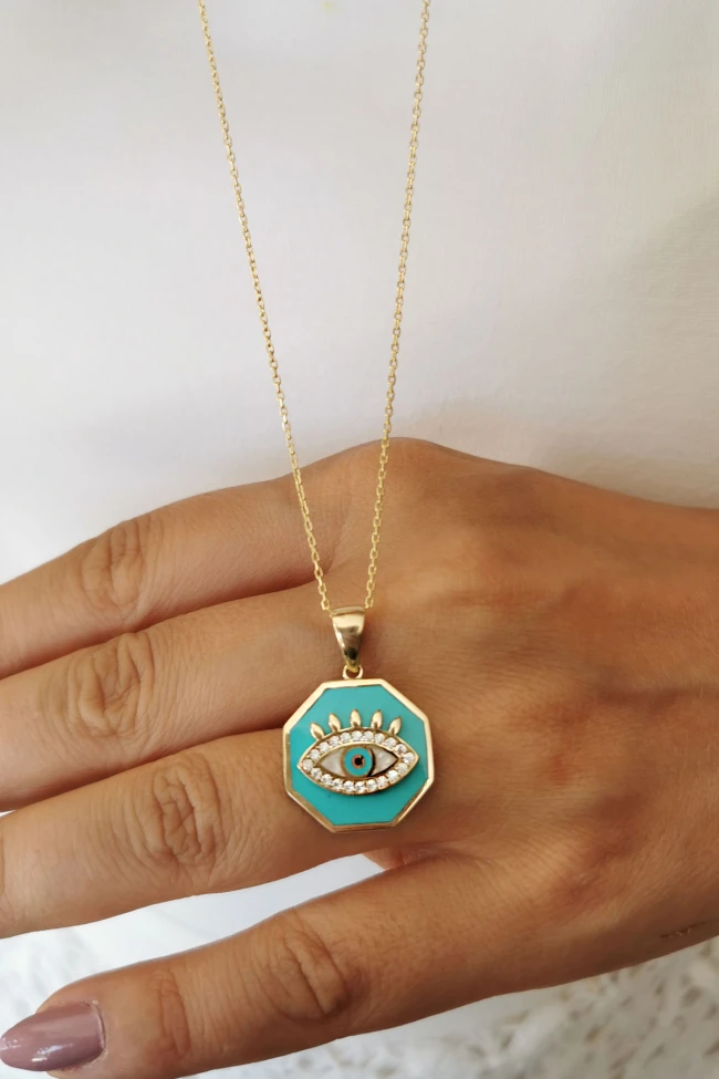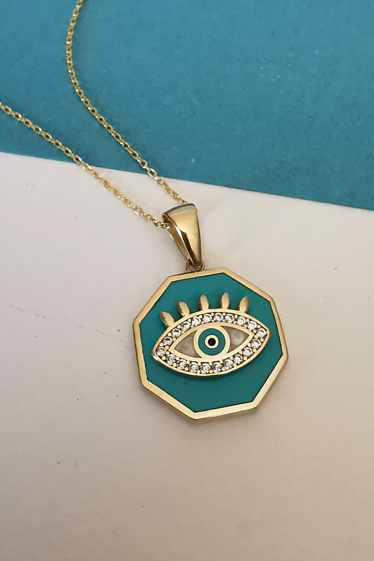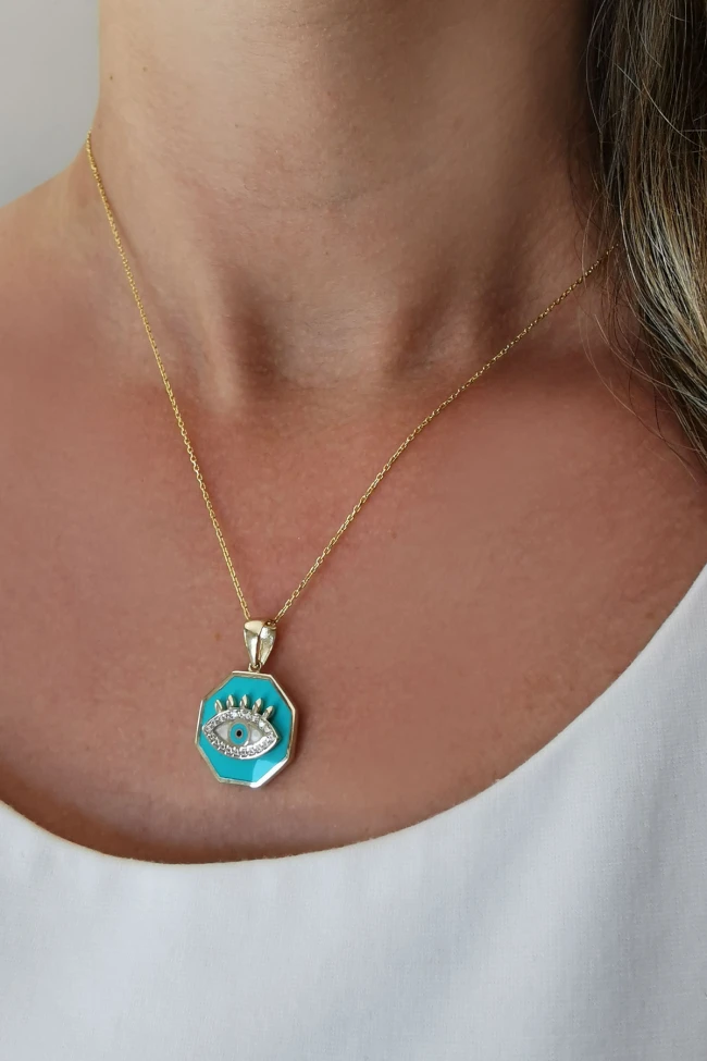 6.90 Gr. 3 Cm boyutunda mavi mineli sekizgen model 14 ayar altın kolye.