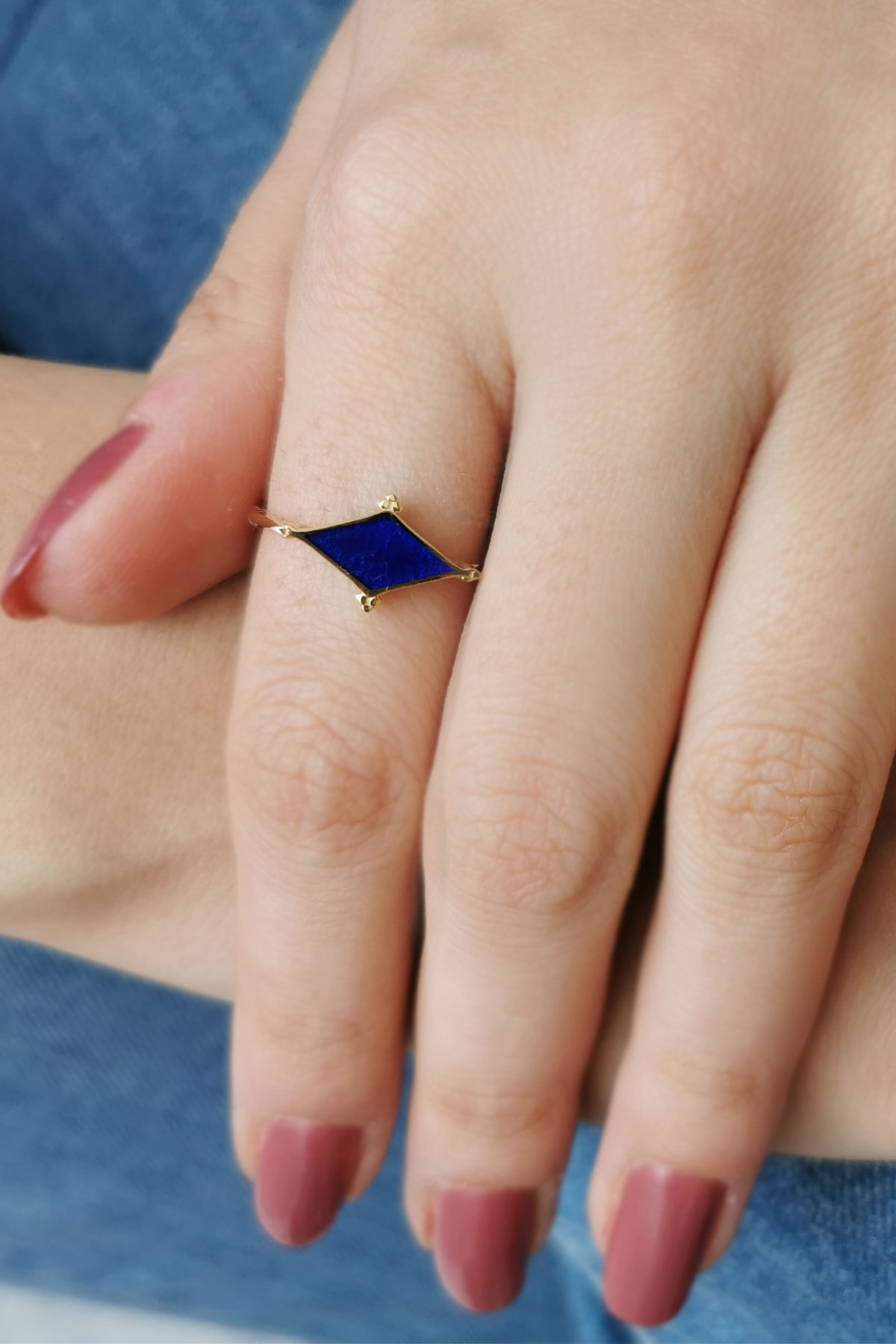 Lacivert mine detaylı baklava model 14 ayar sarı altın tasarımıyla günlük kullanıma uygun 1.55 gram ağırlığında kadın yüzük.