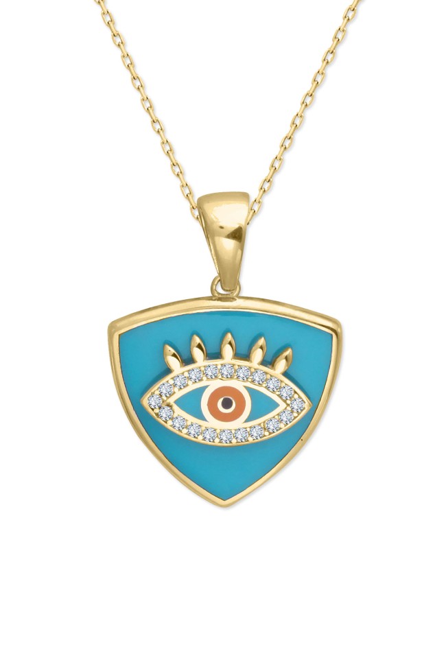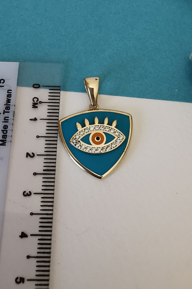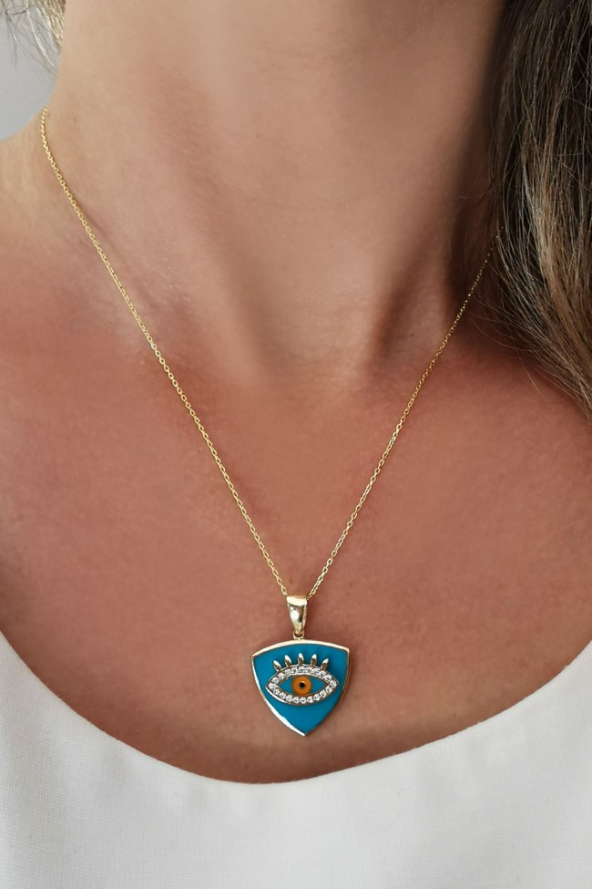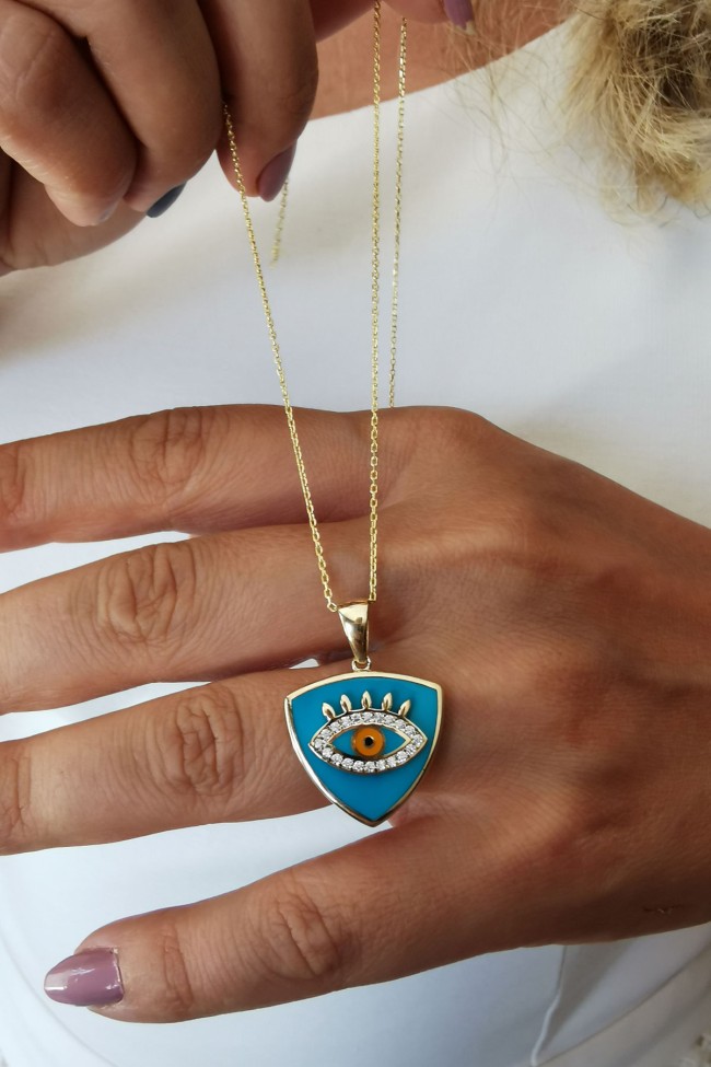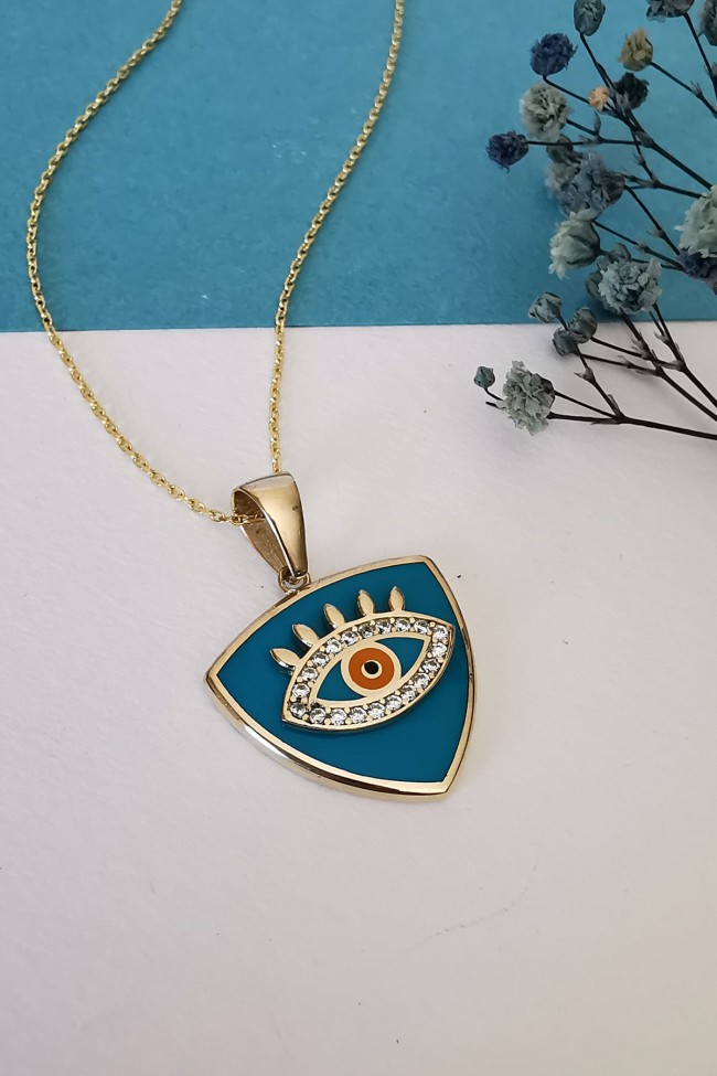 6.60 gr. 3 cm boyutunda mavi mineli üçgen model 14 ayar altın kolye.