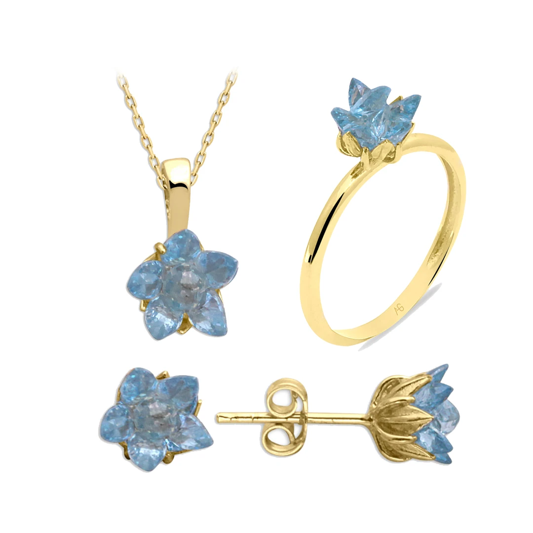 6,00 Gram Ağırlığında El İşçiliğiyle Takılan Markiz Taş Detaylı Minimal Tasarımıyla Oldukça Şık Ve Sade Bir Duruşa Sahip 14 Ayar Altın Aqua Marine Mavi Taşlı Lotus Çiçeği Küpe Kolye Yüzük Takım. -Ruhsal uyanışın ve temizliğin sembolü olan, eşi benzeri doğada bulunmayan mavi renkli lotus çiçeği saflığı ve manevi mükemmelliği temsil eder. *Ürünlerimiz faturalıdır güvenle satın alabilirsiniz, özel hediye kutusunda ücretsiz kargo ile gönderilecektir.