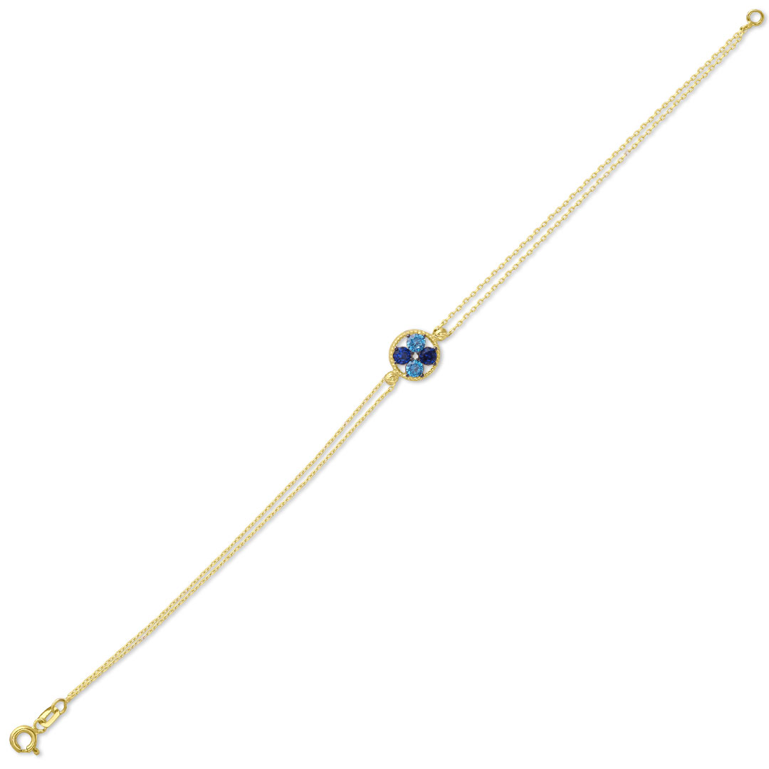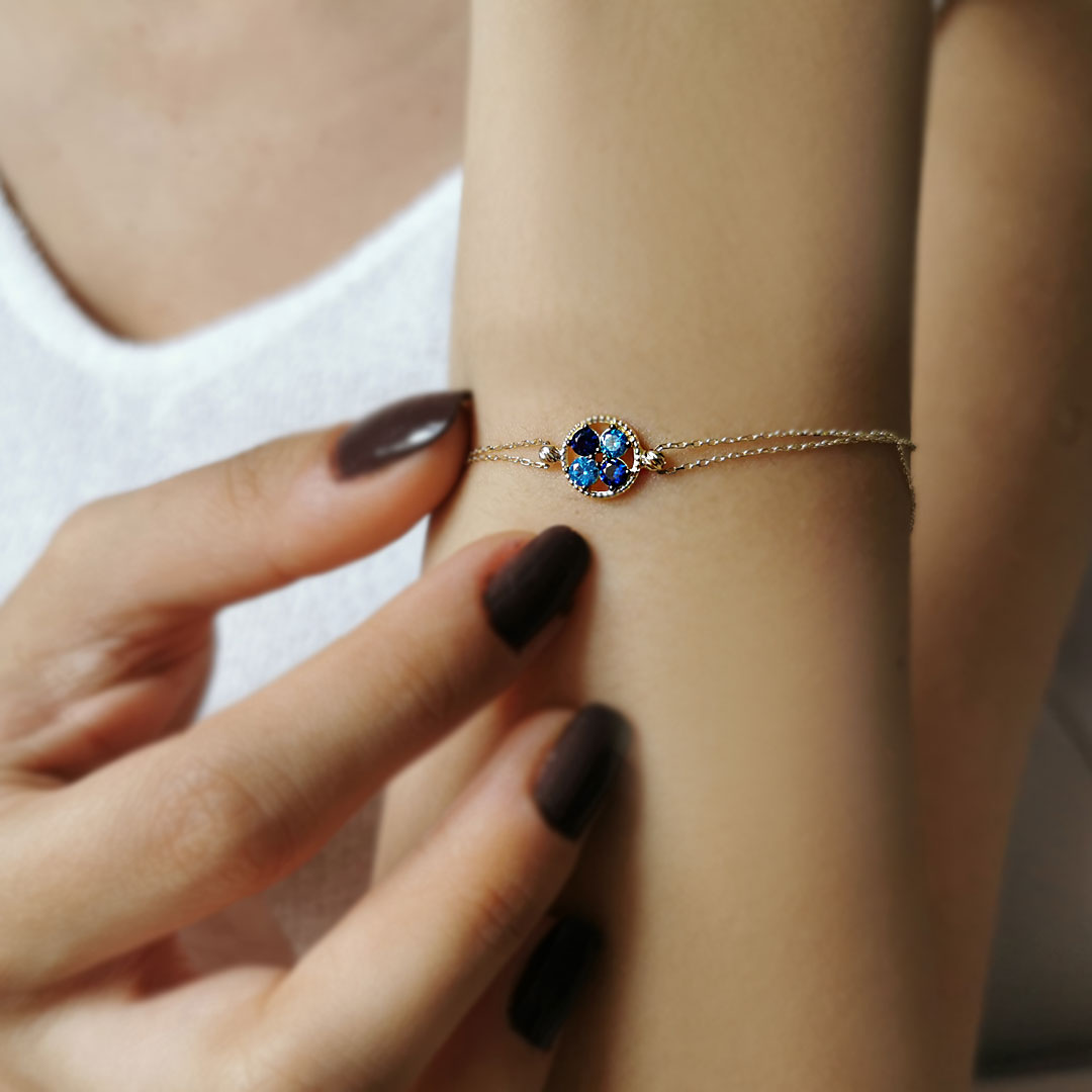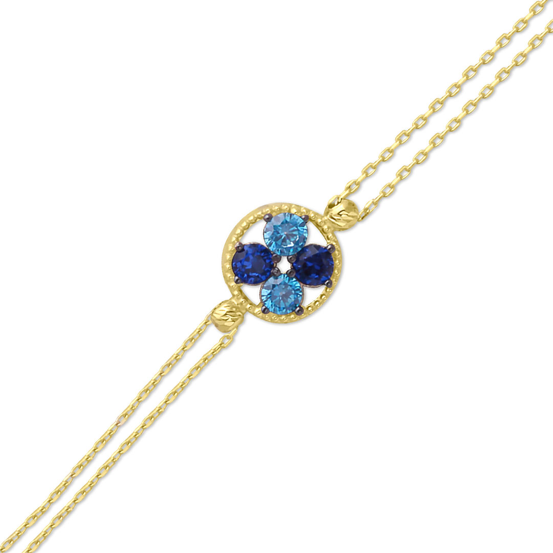 18 Cm boyunda spor hafif tasarımı ile günlük olarak da kullanabileceğiniz 1.50 gr ağırlığında 14 ayar altın mavi beyaz taş kombin detaylı minimal bileklik.